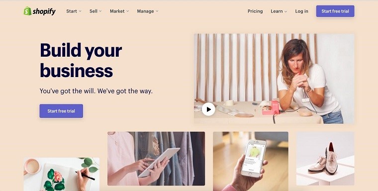 Một trong những ví dụ tuyệt vời về chủ nghĩa tối giản đầy màu sắc trong thiết kế website, bạn có thể tham khảo giao diện trang chủ của Shopify.