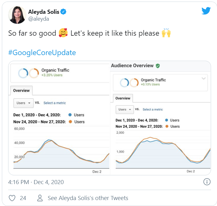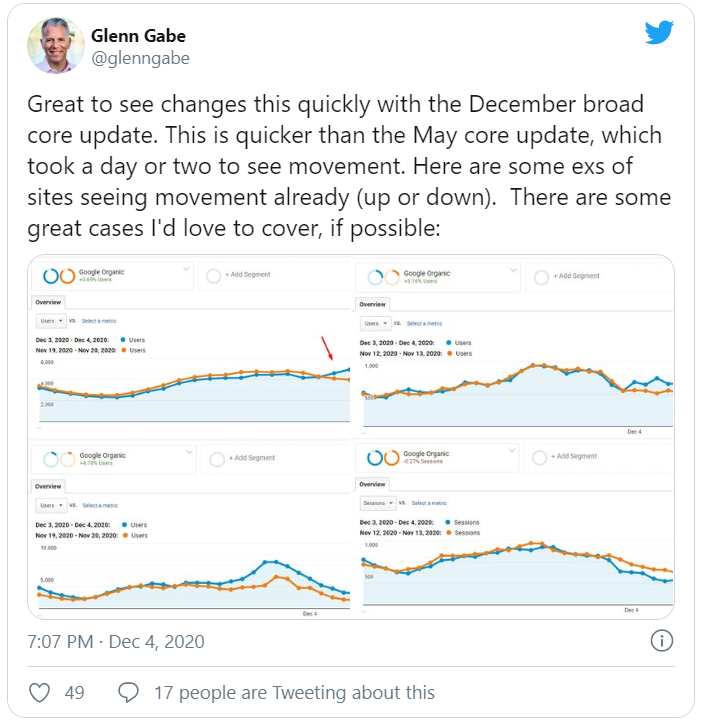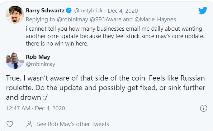 Mặt khác, những trang bị ảnh hưởng xấu từ đợt Google Core update tháng 5 rất mong chờ vào Core Update tháng 12 này để hồi phục. Trích lời của Barry Schwartz trên Twitter: