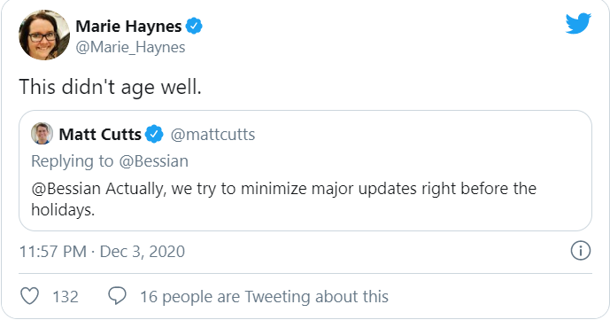 Và bây giờ Google Core Update lại rơi vào ngay trước kì nghỉ lễ. Marie đã bình luận một cách bóng gió về sự thiếu lập trường này của Google.