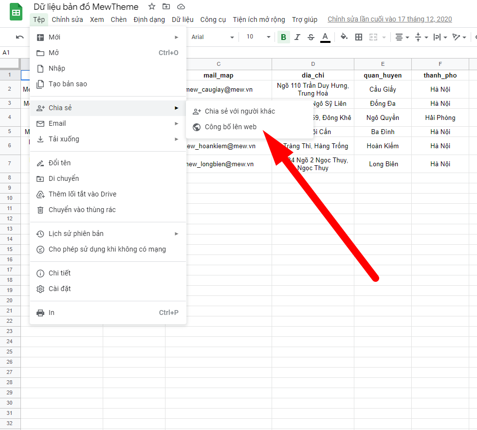 Bước 3: Tạo google trang tính khi không dùng API áp dụng cho các theme mới từ MewMall trở đi