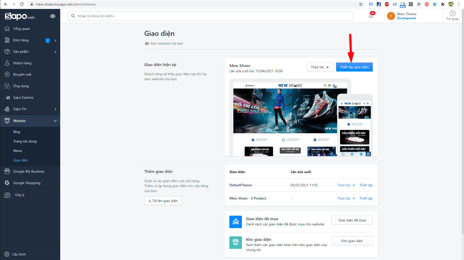 Sau khi cài đặt theme mới lên cửa hàng, bạn bấm vào THIẾT LẬP GIAO DIỆN để tùy chỉnh theme.