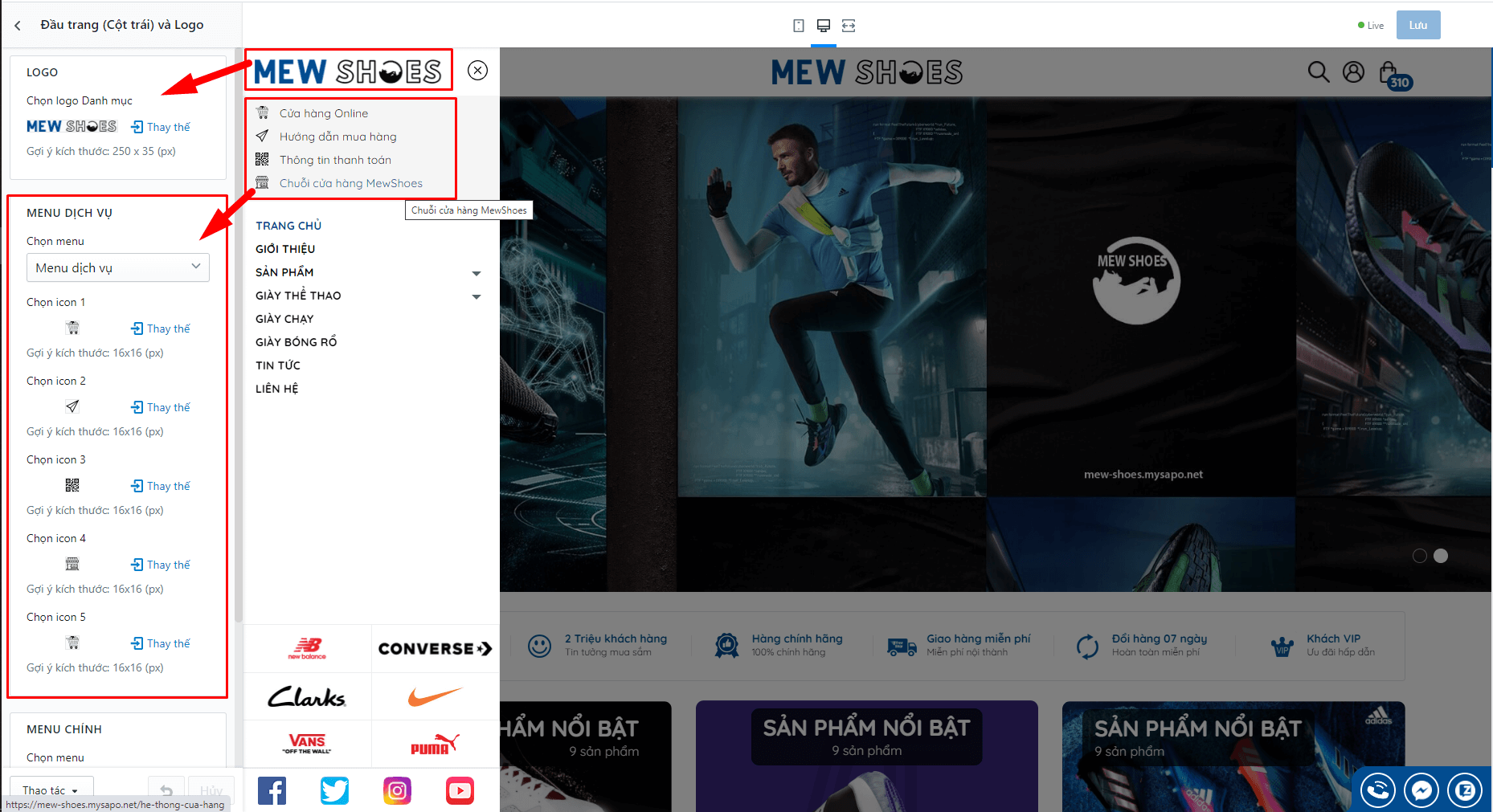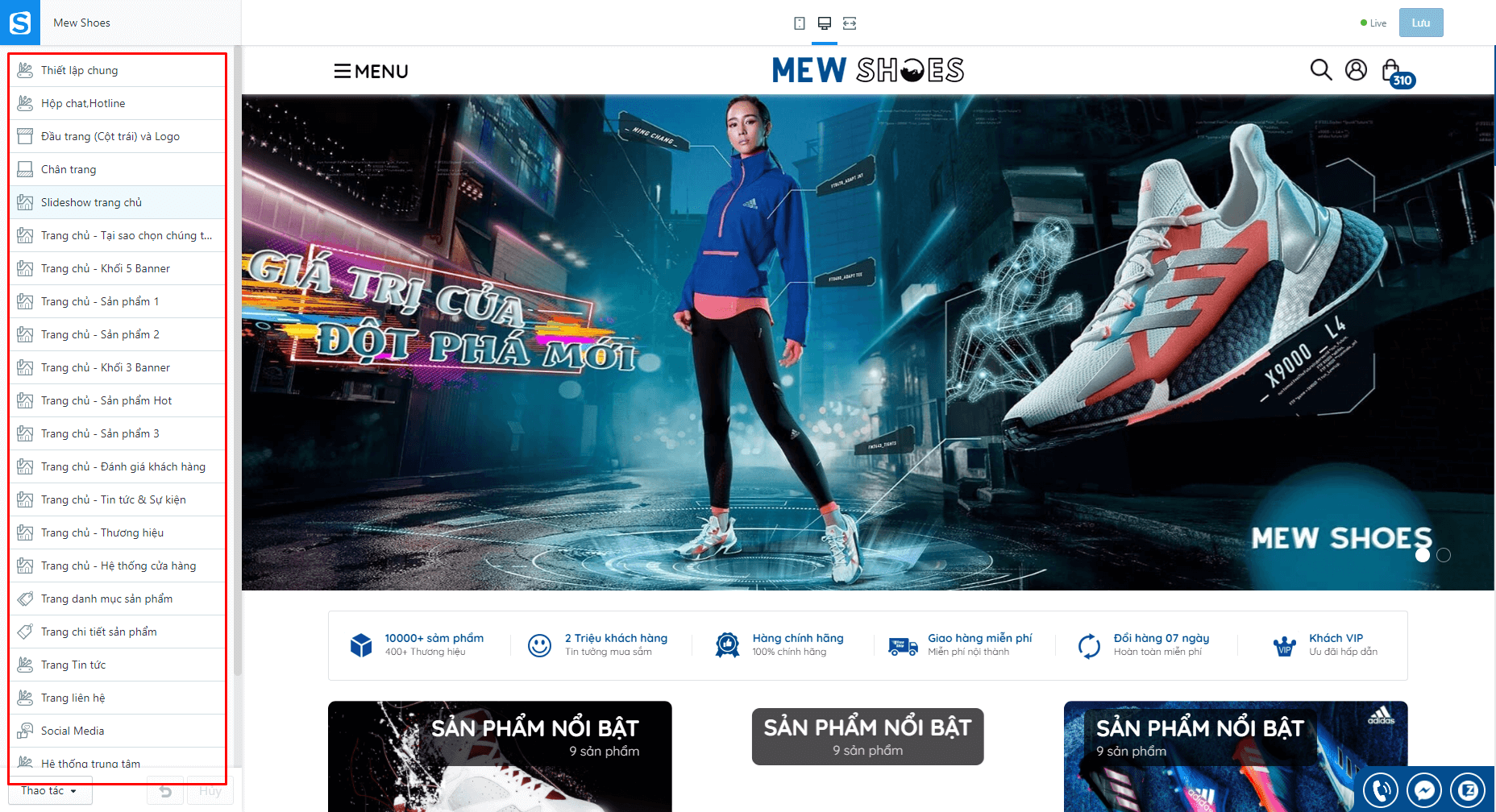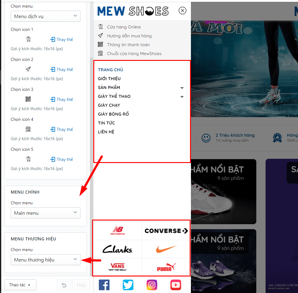 Tại đây sẽ có thiết lập thông tin cơ bản website, Các menu link đa dạng tùy biến theo menu của chủ shop.