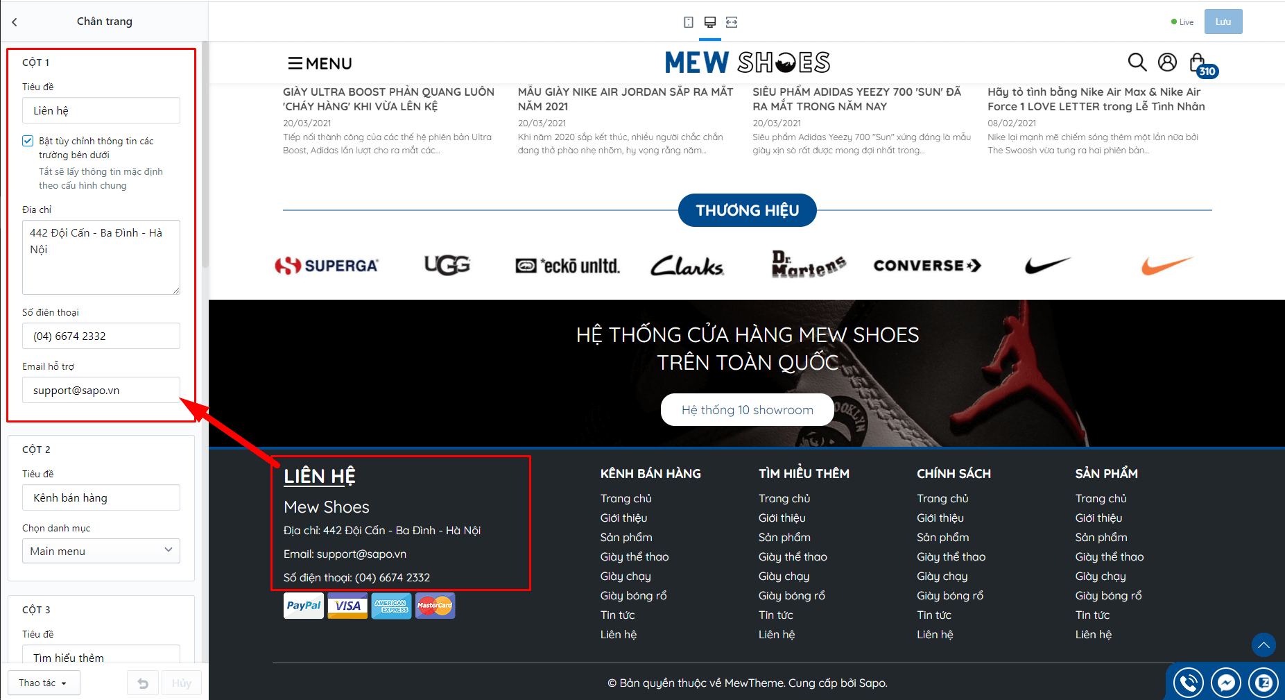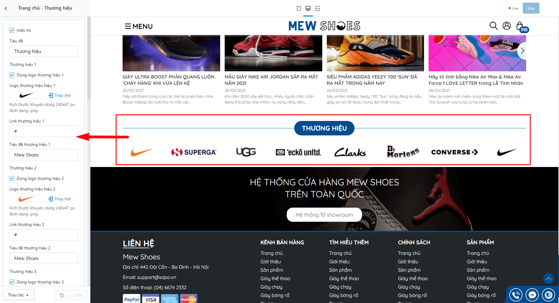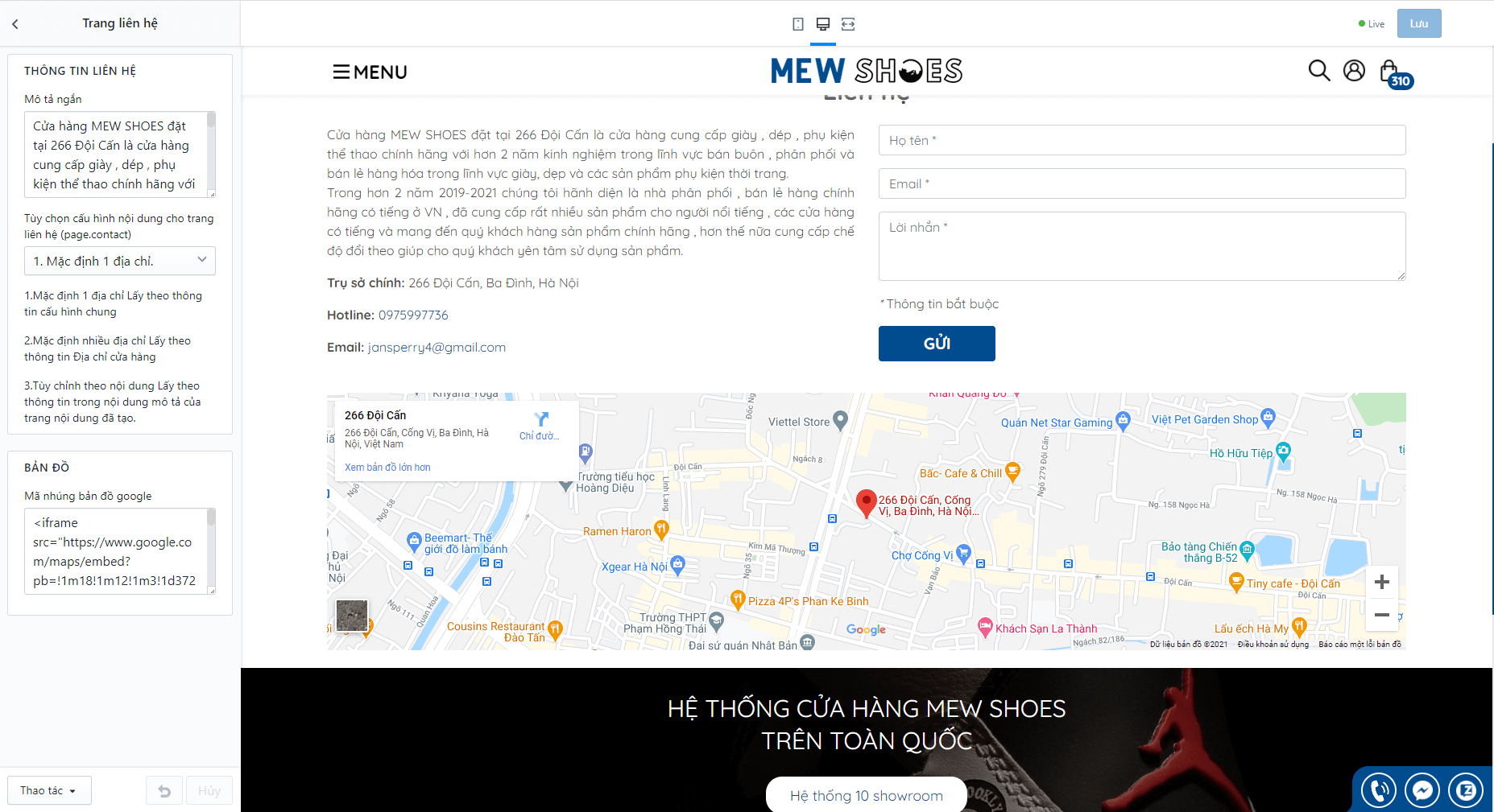 Tại đây sẽ có thiết lập thông tin cơ bản website, Các menu link đa dạng tùy biến theo menu của chủ shop.