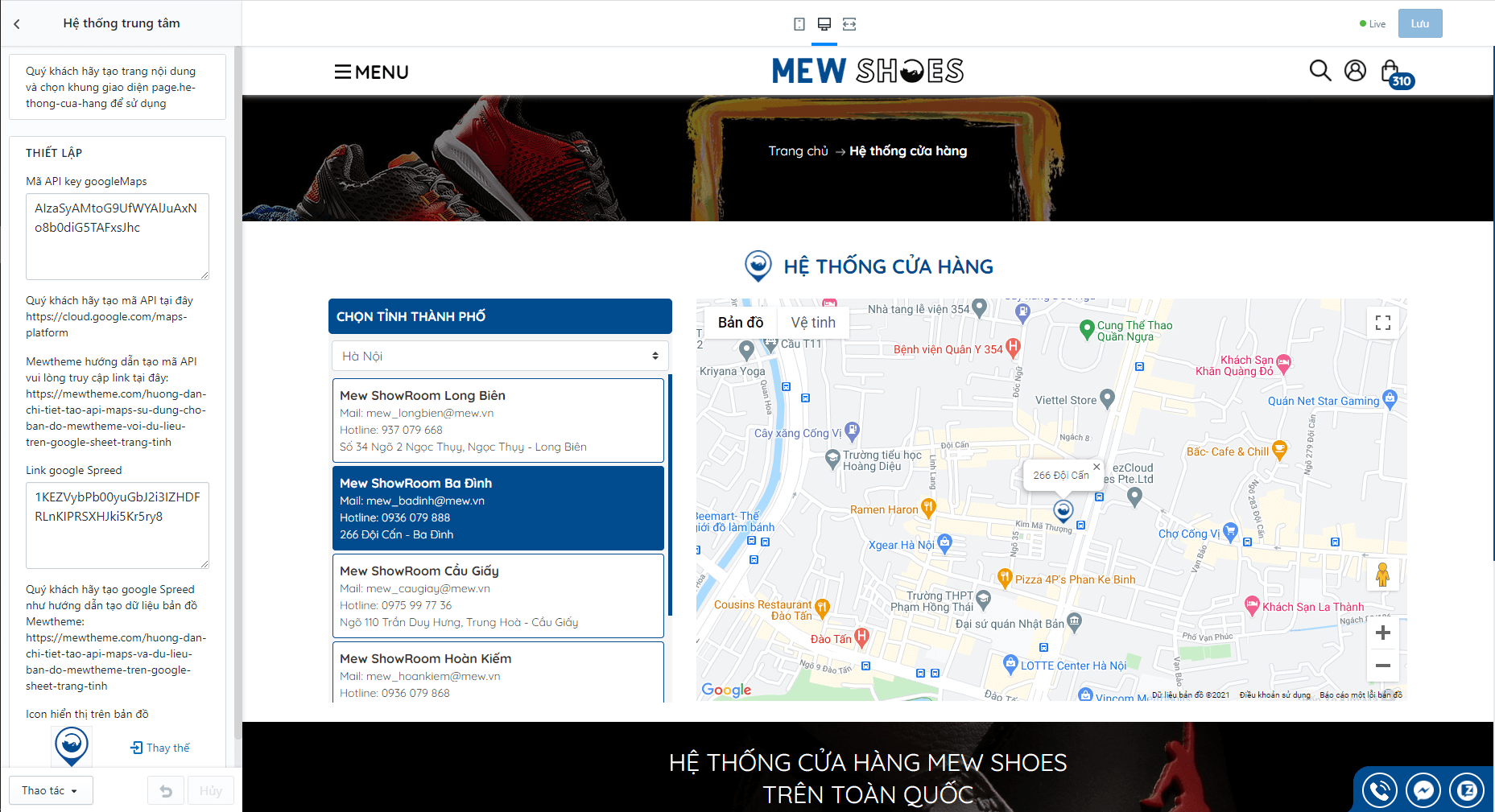 Với hệ thống trung tâm sử dụng API Google Maps như 1 đặc thù của MewTheme bạn có thể xem: Hướng dẫn chi tiết tạo API Maps và dữ liệu bản đồ trên google sheet(Trang tính) tại đây.