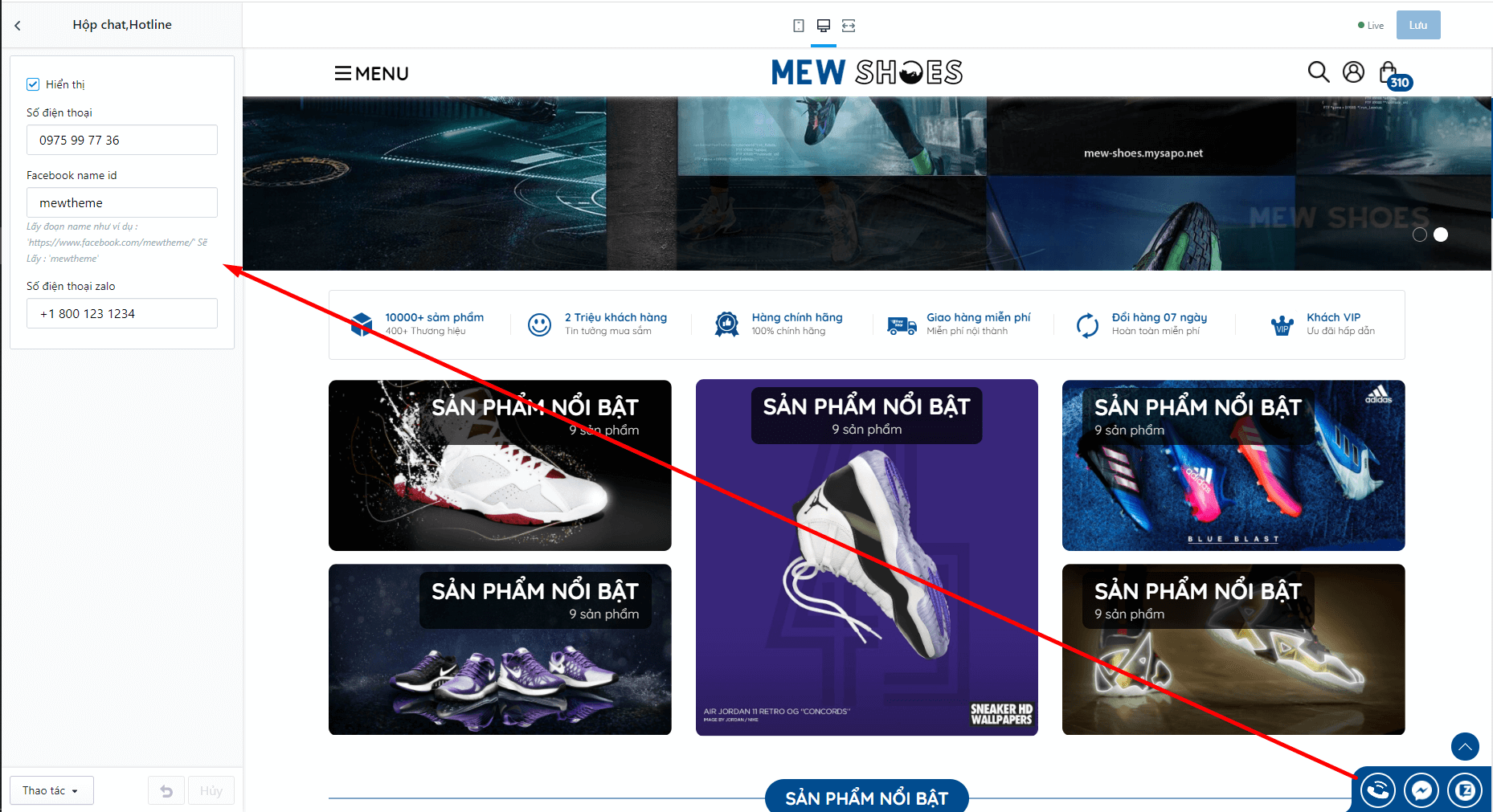 MewTheme luôn để sẵn module liên kết chat mesenger và Zalo cùng hotline chạy theo trang.