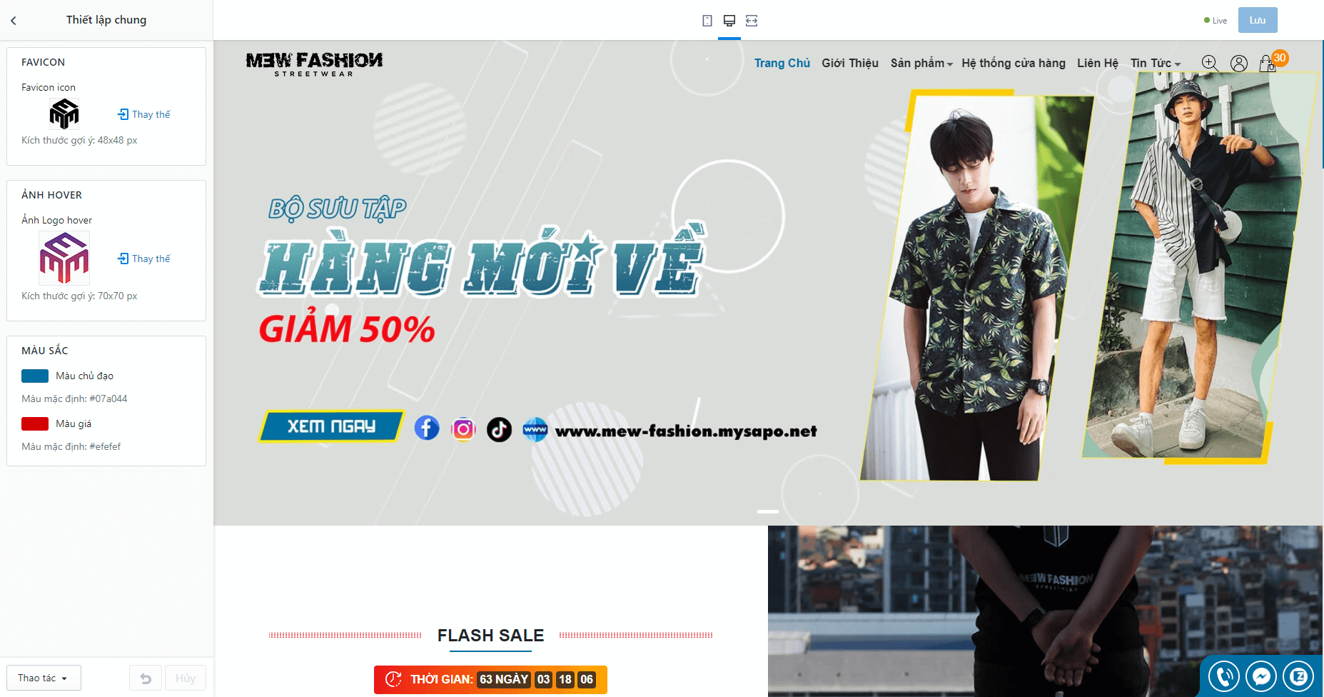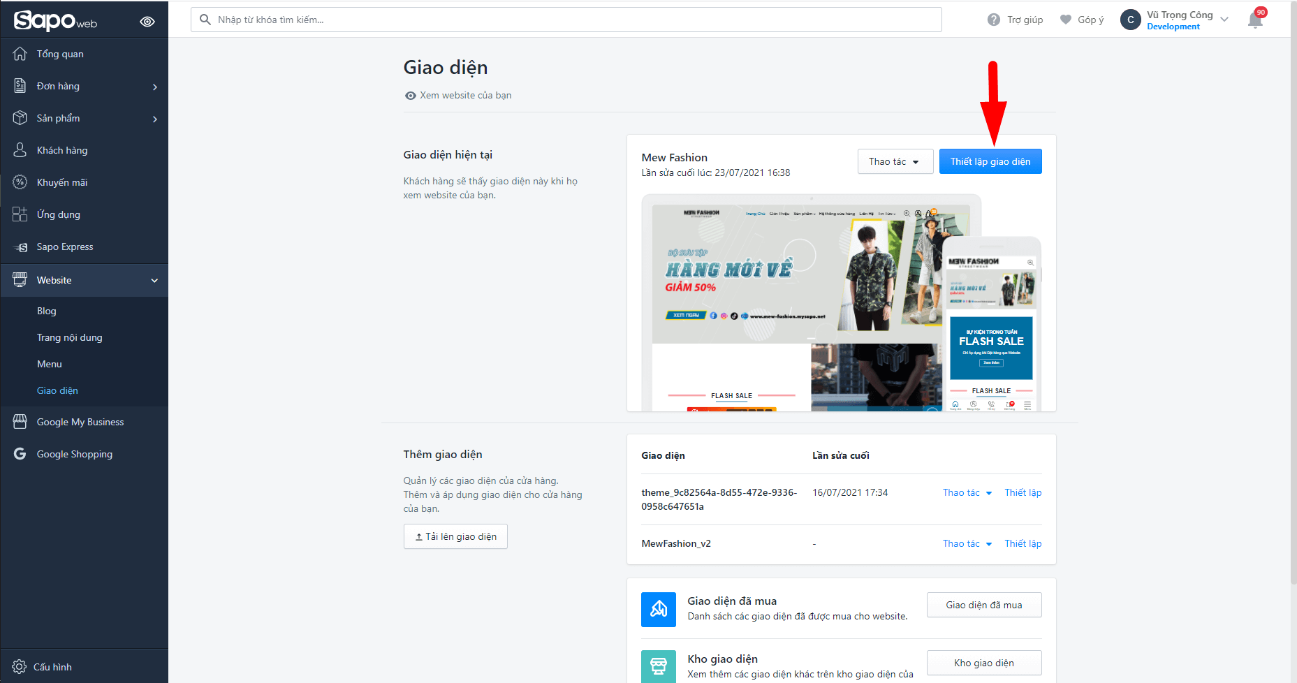 Sau khi cài đặt theme mới lên cửa hàng, bạn bấm vào THIẾT LẬP GIAO DIỆN để tùy chỉnh theme.