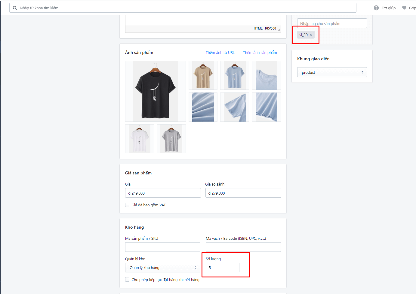 Tại đây chúng ta sử dụng cú pháp tag trên mỗi sản phẩm theo: sl_(Số lượng sản phẩm chiến dịch) đồng thời set tồn kho là số sản phẩm còn lại có thể bán như hình dưới.