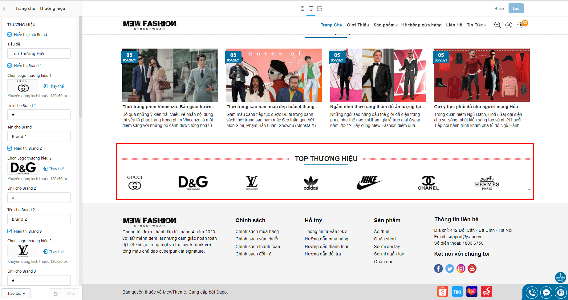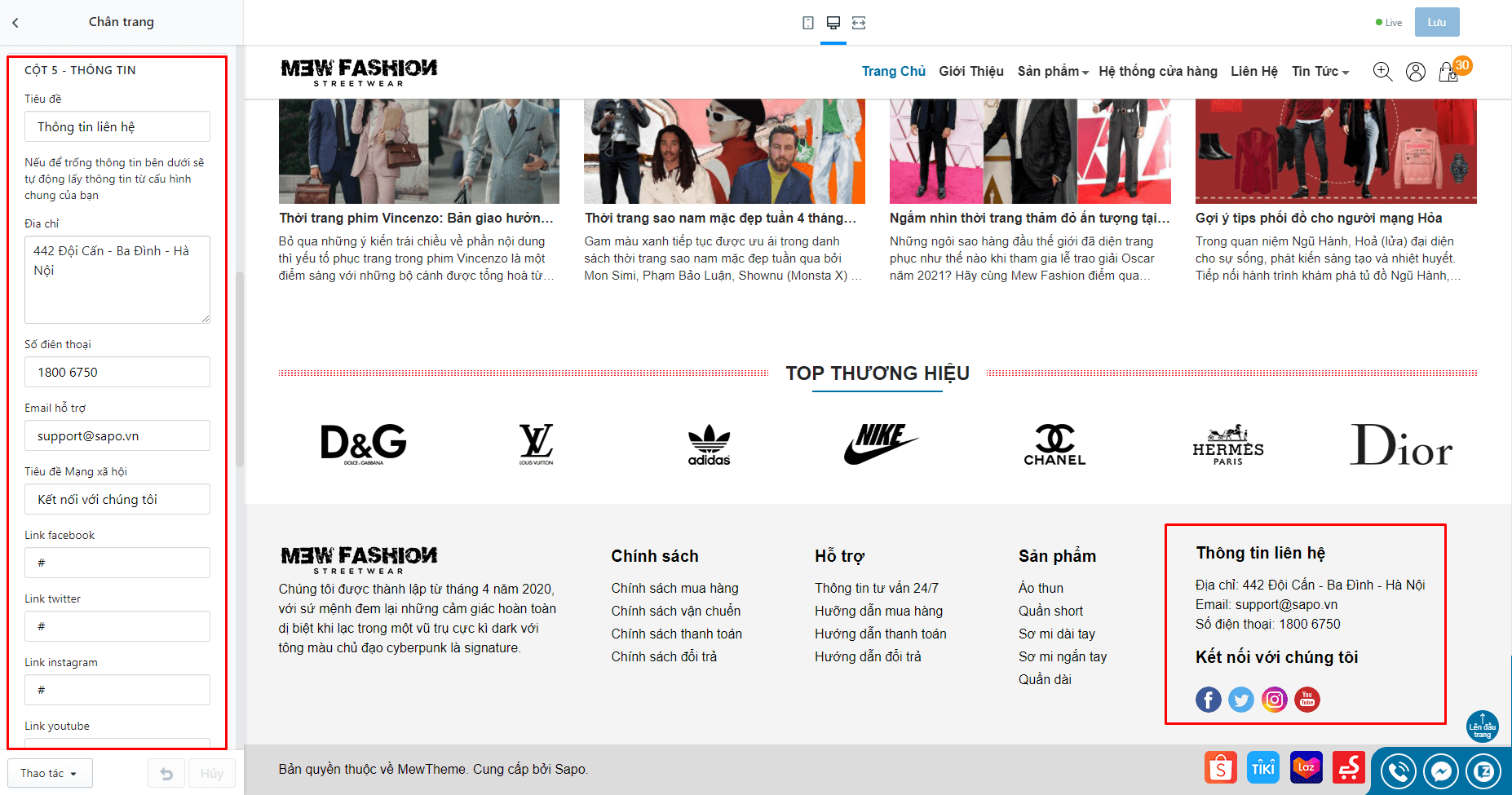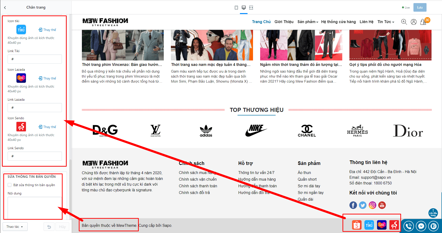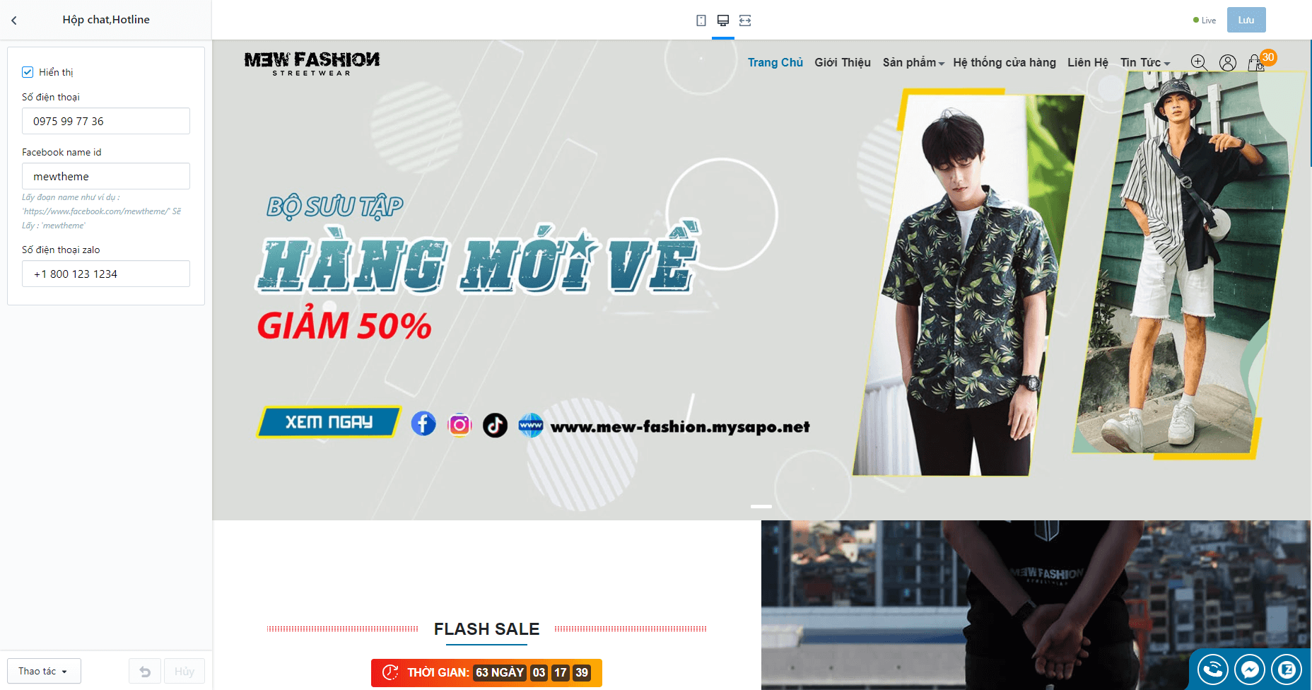 MewTheme luôn để sẵn module liên kết chat mesenger và Zalo cùng hotline chạy theo trang.