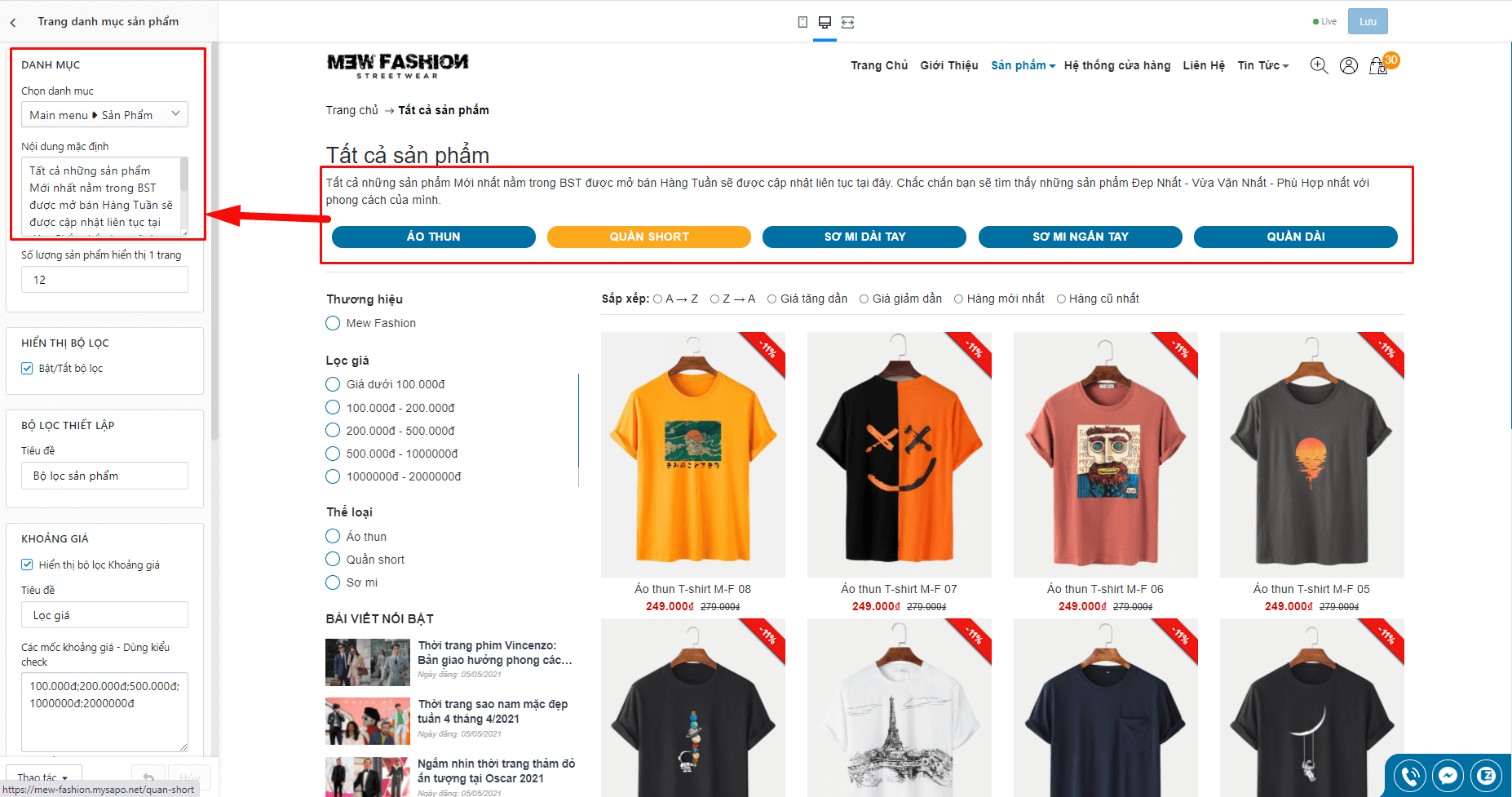 - Thiết lập mô tả cho trang tất cả sản phẩm. Với các danh mục cụ thể sẽ lấy mô tả chi tiết của thiết lập quản trị danh mục sản phẩm.