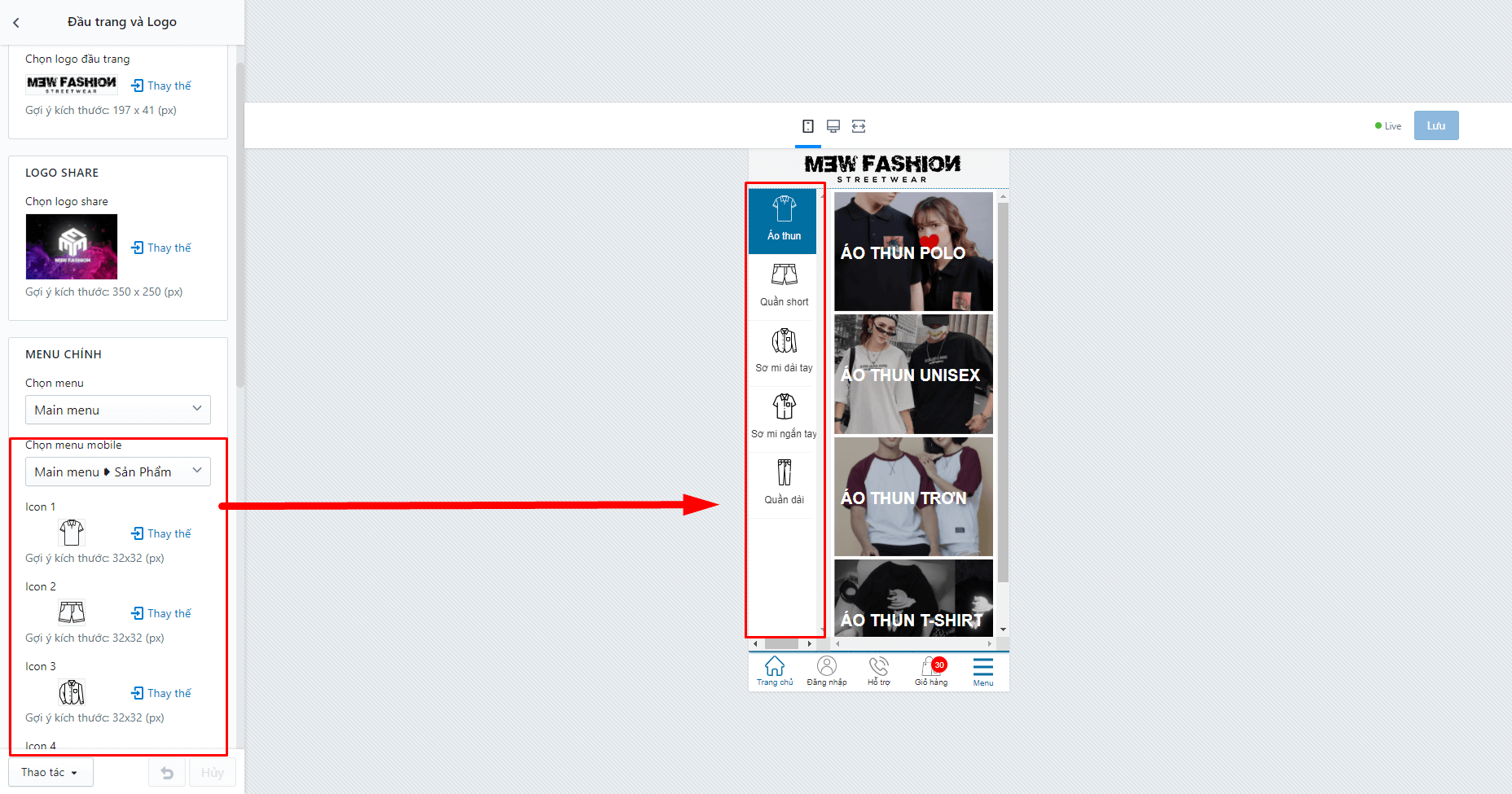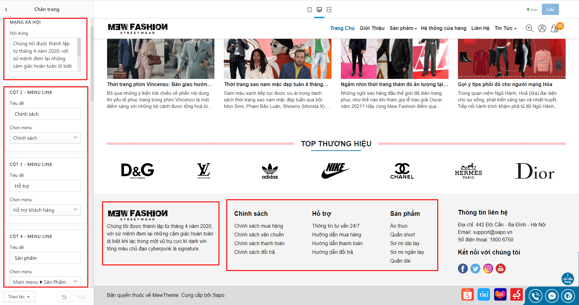 - Các menu link đa dạng tùy biến theo menu của chủ shop.