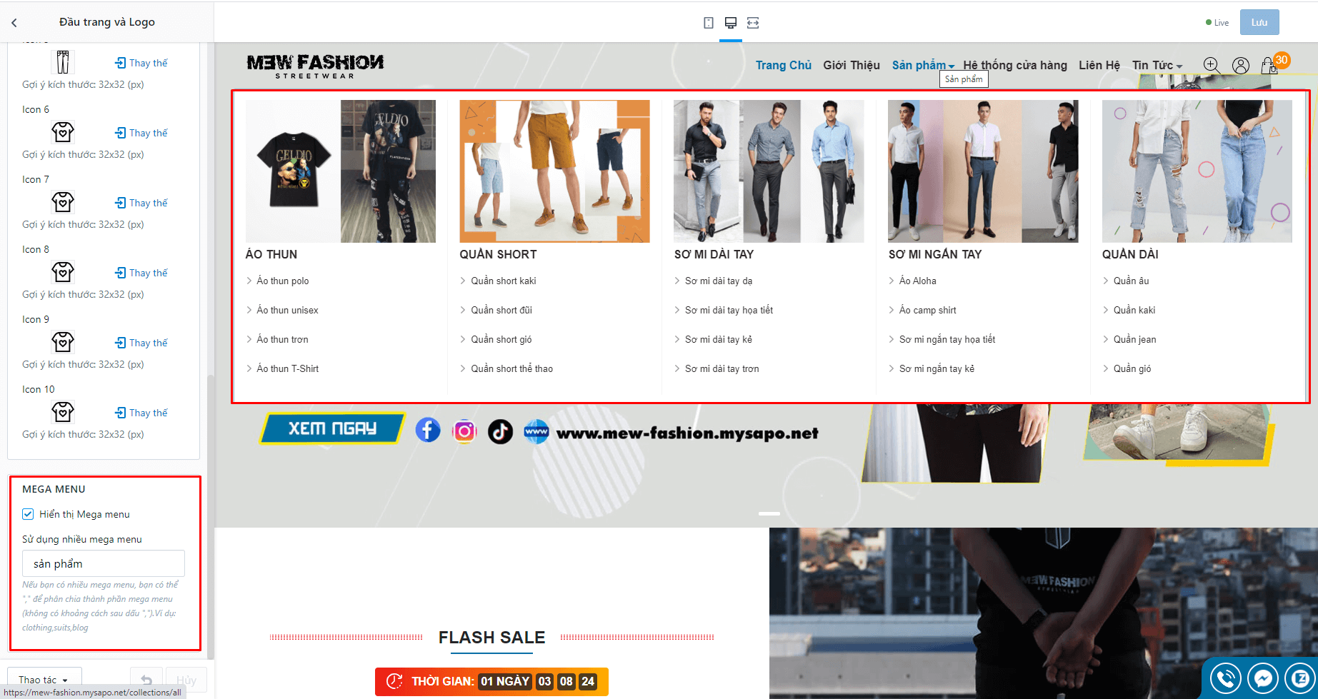 - Mega menu (PC) (Tại menu chính, bạn cần hiển thị mega menu hãy điền tên vào ô nhập như ảnh - chữ thường - có thể nhập nhiều mega menu bằng cách sử dụng dấu ",")