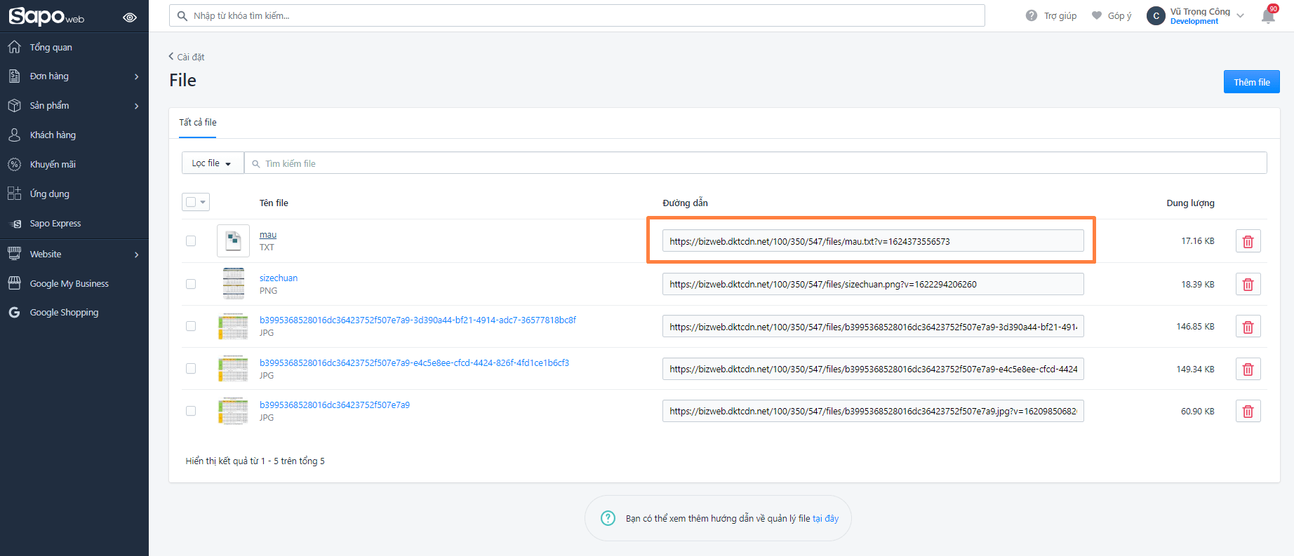 - Bước 3: Tải file txt đã tạo vào quản lý file tại SapoWeb của bạn - Copy đường dẫn như ảnh minh họa
