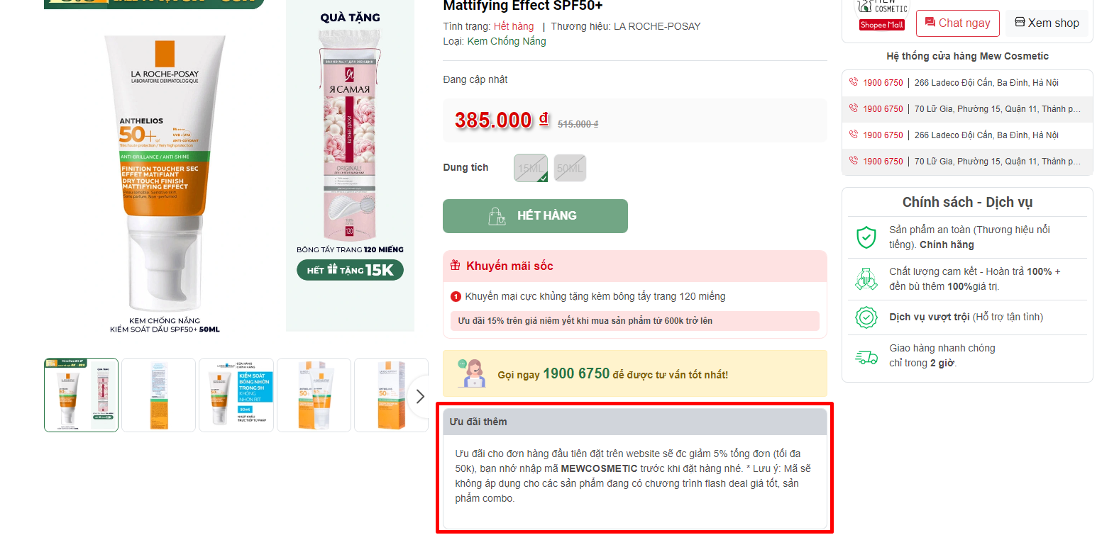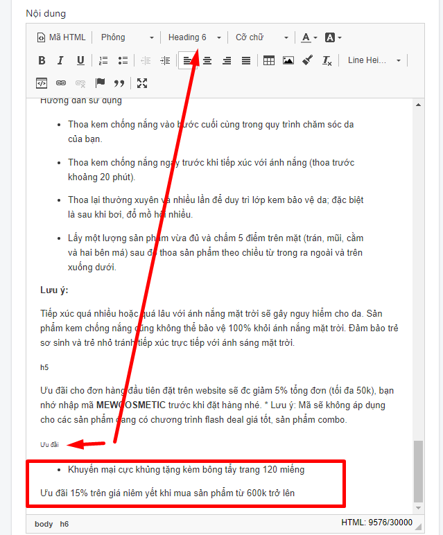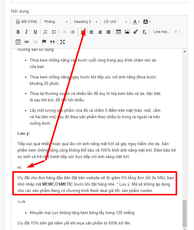 Các thông báo ưu đãi thêm sẽ được hiển thị ở trang chi tiết sản phẩm được dung trong nội dung sản phẩm đặt bằng tiêu đề thẻ h5.
