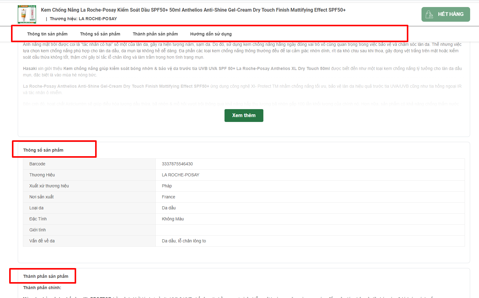 Nội dung thông tin sản phẩm được hiển thị trong trang chi tiết sản phẩm được bố cục theo tiêu đề thẻ