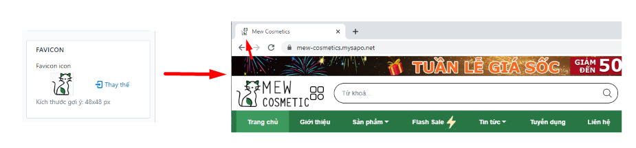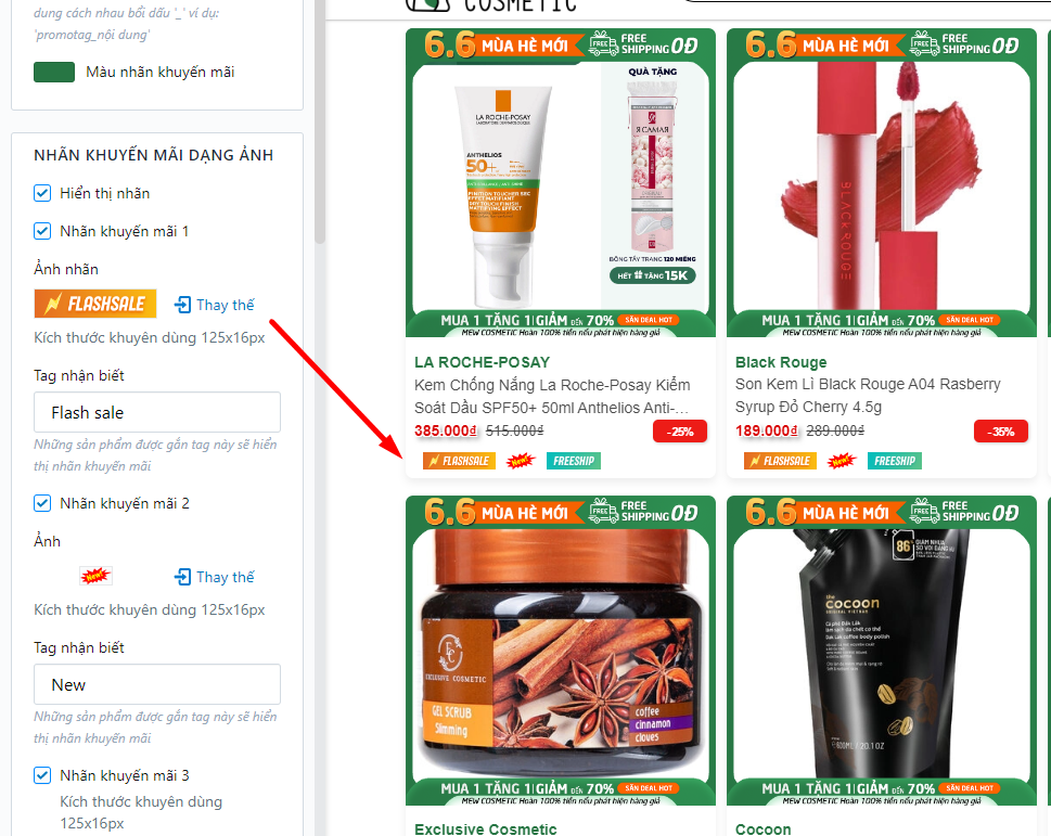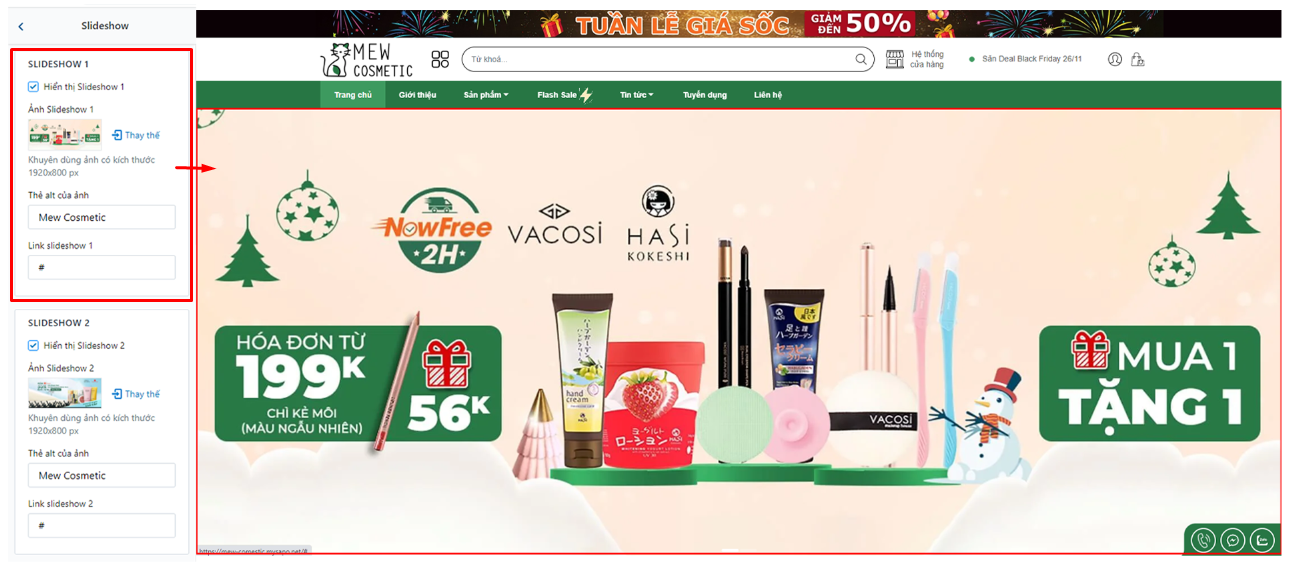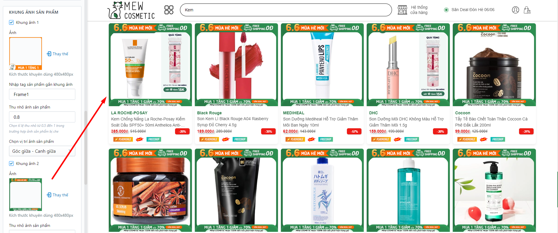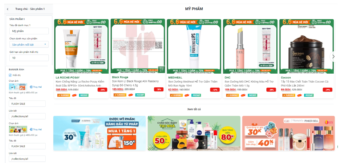 Với tính năng này, theme MEW Cosmetics sẽ giúp chủ website tiết kiệm đến hơn 90% thời gian trang trí sản phẩm mỗi khi chạy sự kiện, chiến dịch quảng cáo.