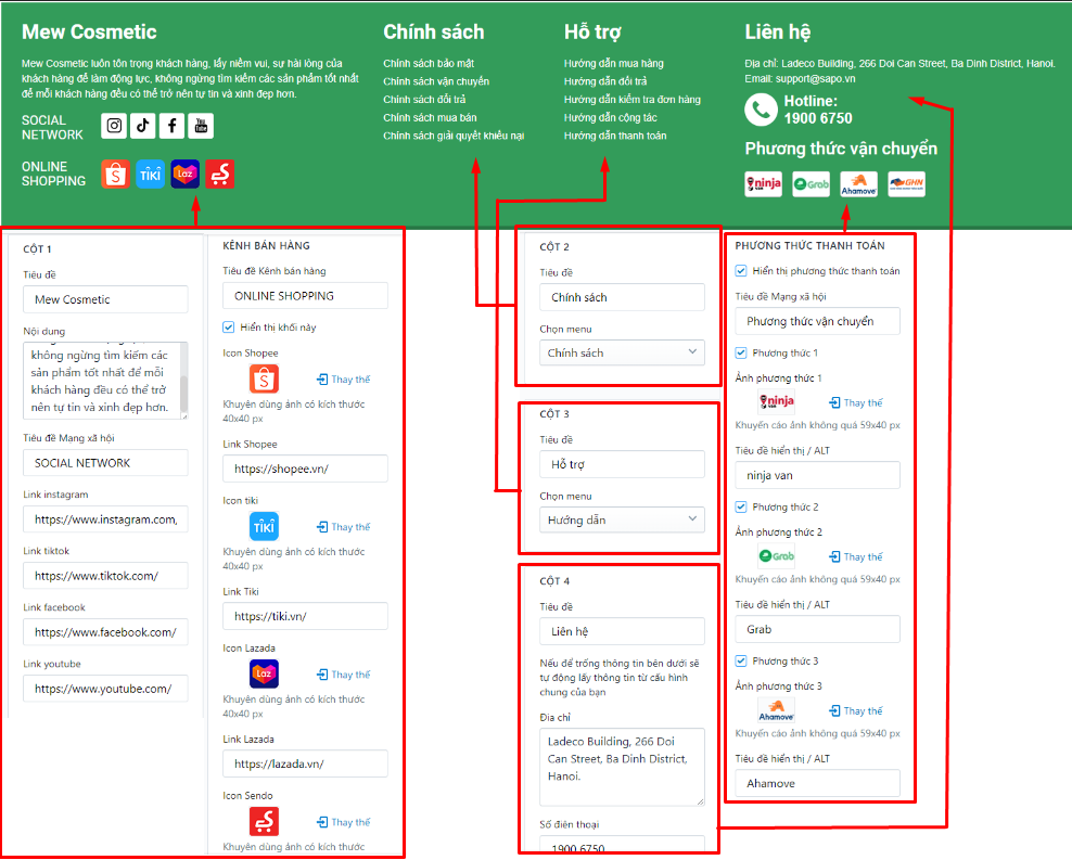 - Quản lý và thiết lập các mục liên quan đến phần chân trang