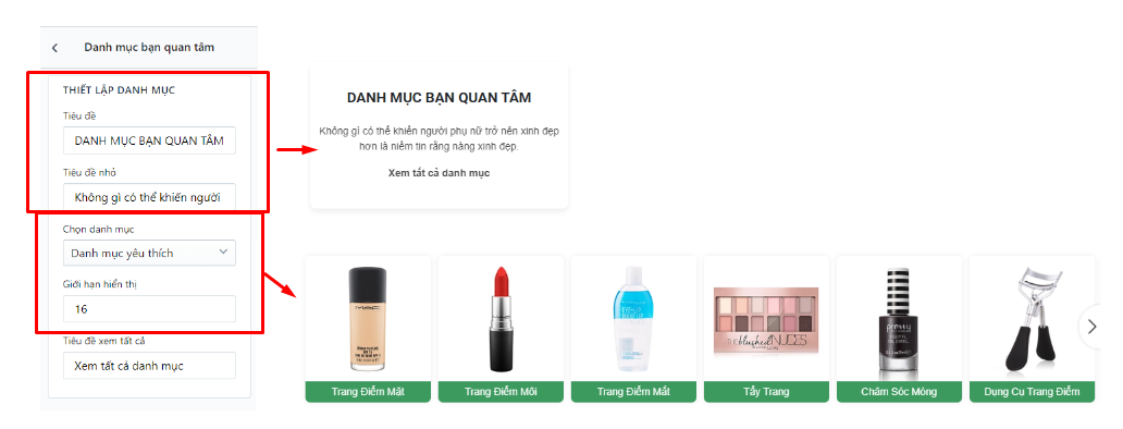 Truy cập Admin > Thiết lập giao diện > Tang chủ - Danh mục bạn quan tâm