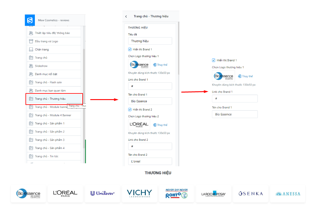 Truy cập Admin > Thiết lập giao diện > Trang chủ - Thương Hiệu