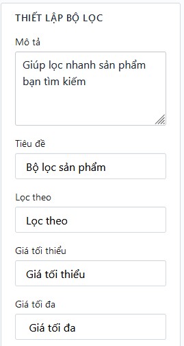 - Thiết lập text cho bộ lọc, thay đổi tiêu đề, mô tả và một số trường liên quan, quý khách có thể điều chỉnh cho phù hợp với nhu cầu sử dụng của cửa hàng, hoặc có thể thay đổi ngôn ngữ nếu không muốn sử dụng tiếng Việt