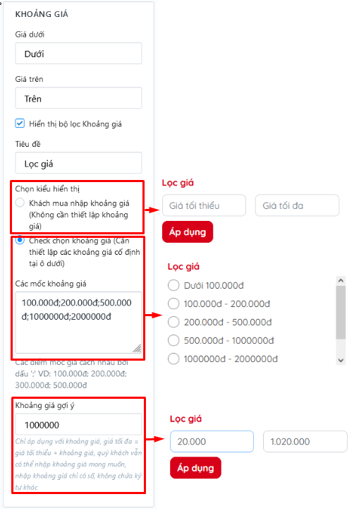 - Lọc theo khoảng giá có sẵn, các khoảng giá sẽ được phân chia theo thứ tự từ thiết lập giao diện