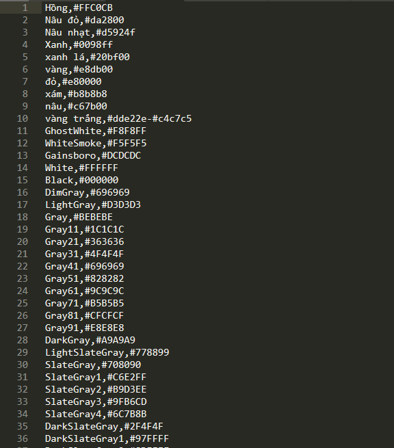 - Bước 2: Bạn tạo 1 file .txt với nội dung bên trong file : Tên màu, Mã màu như ảnh minh họa.