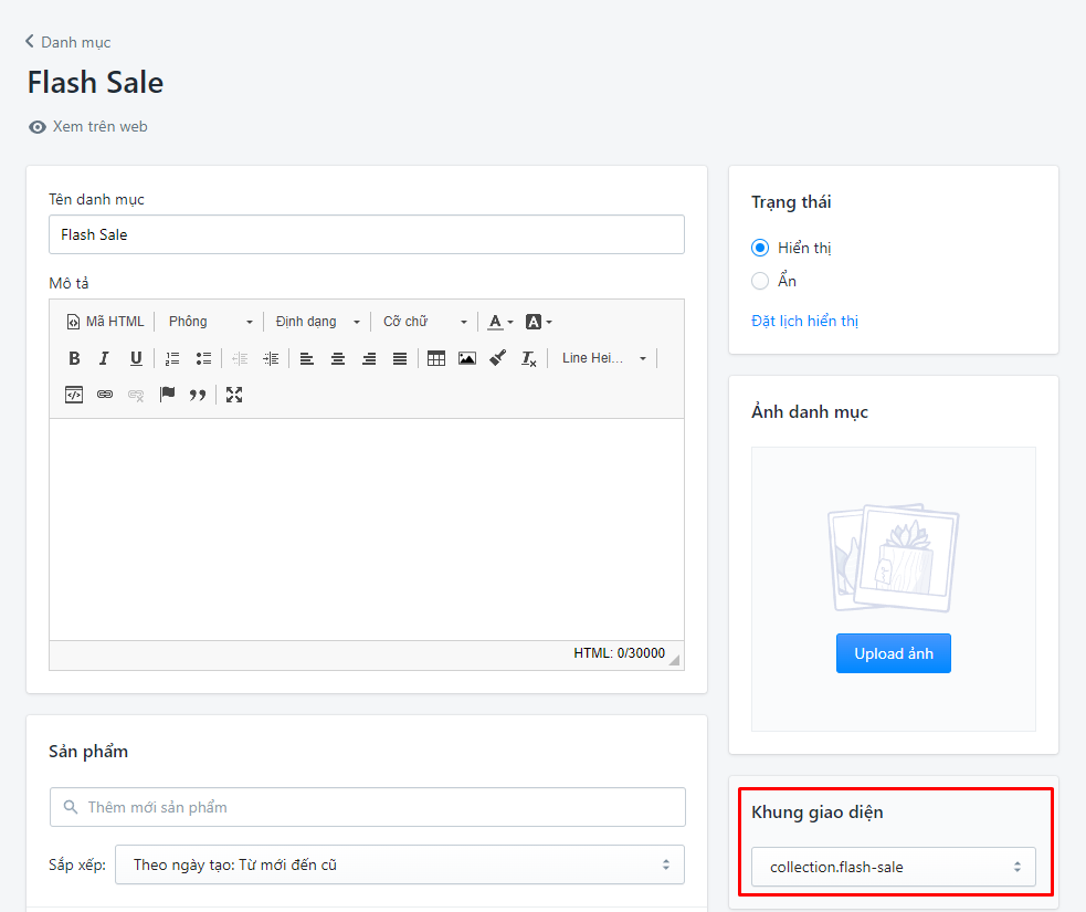 Thêm danh mục và chọn khung hiển thị collection.flash-sale