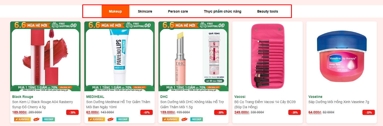 Khu vực trình bày danh mục sản phẩm nổi bật nhất tại trang chủ, kèm đồng hồ đếm ngược bắt mắt sẽ kích thích mua hàng cực kì hiệu quả.