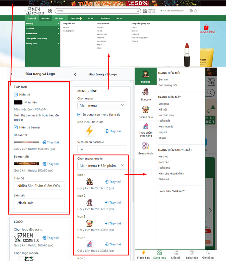 - Quản lý và thiết lập các mục liên quan đến phần đầu trang/ logo cũng như quản lý tuỳ chọn menu của bản PC và Mobile
