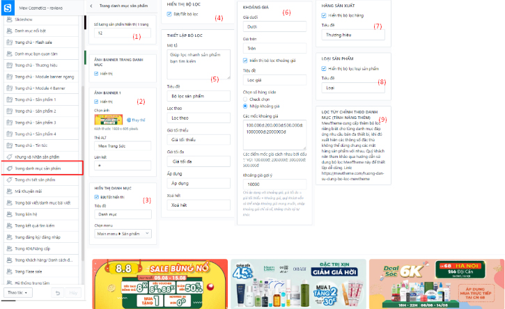 - (4) Bật/tắt hiển thị bộ lọc sản phẩm, cấu hình cho từng bộ lọc, chi tiết ở mục số 20