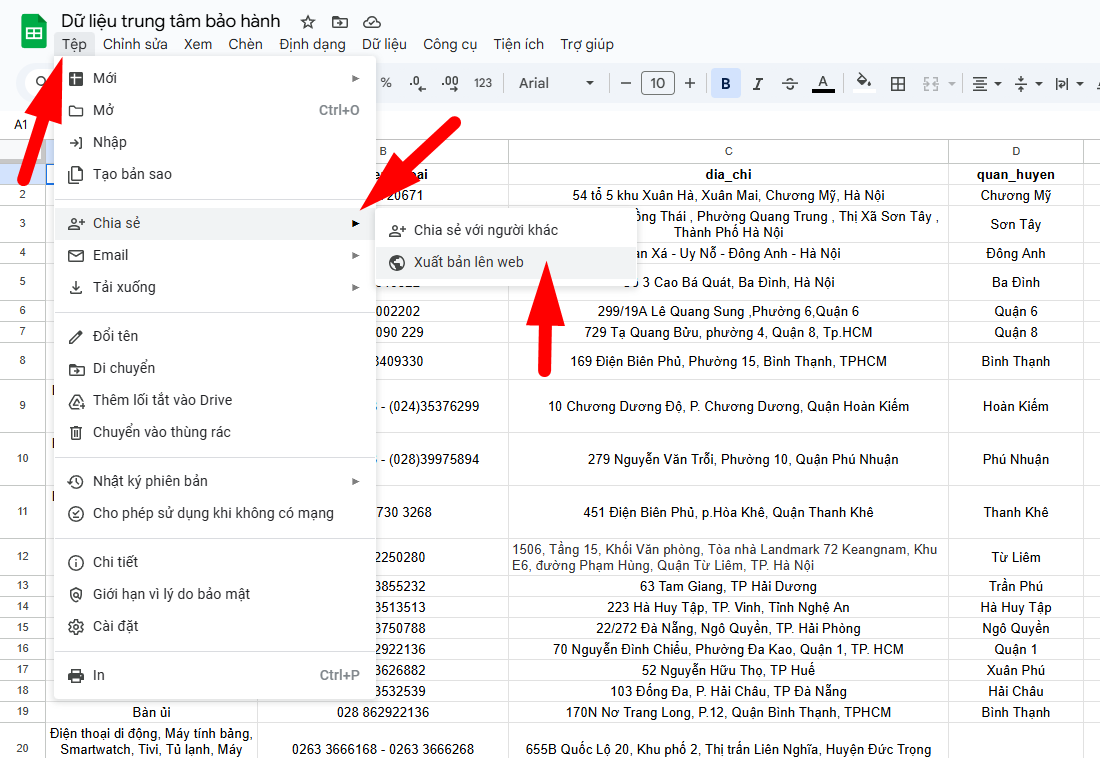 Bước 2: Chọn mục Tệp => Chia sẻ => Xuất bản lên web