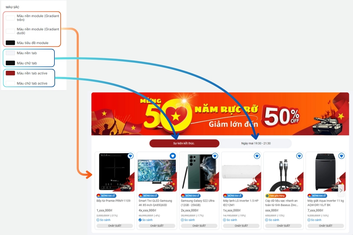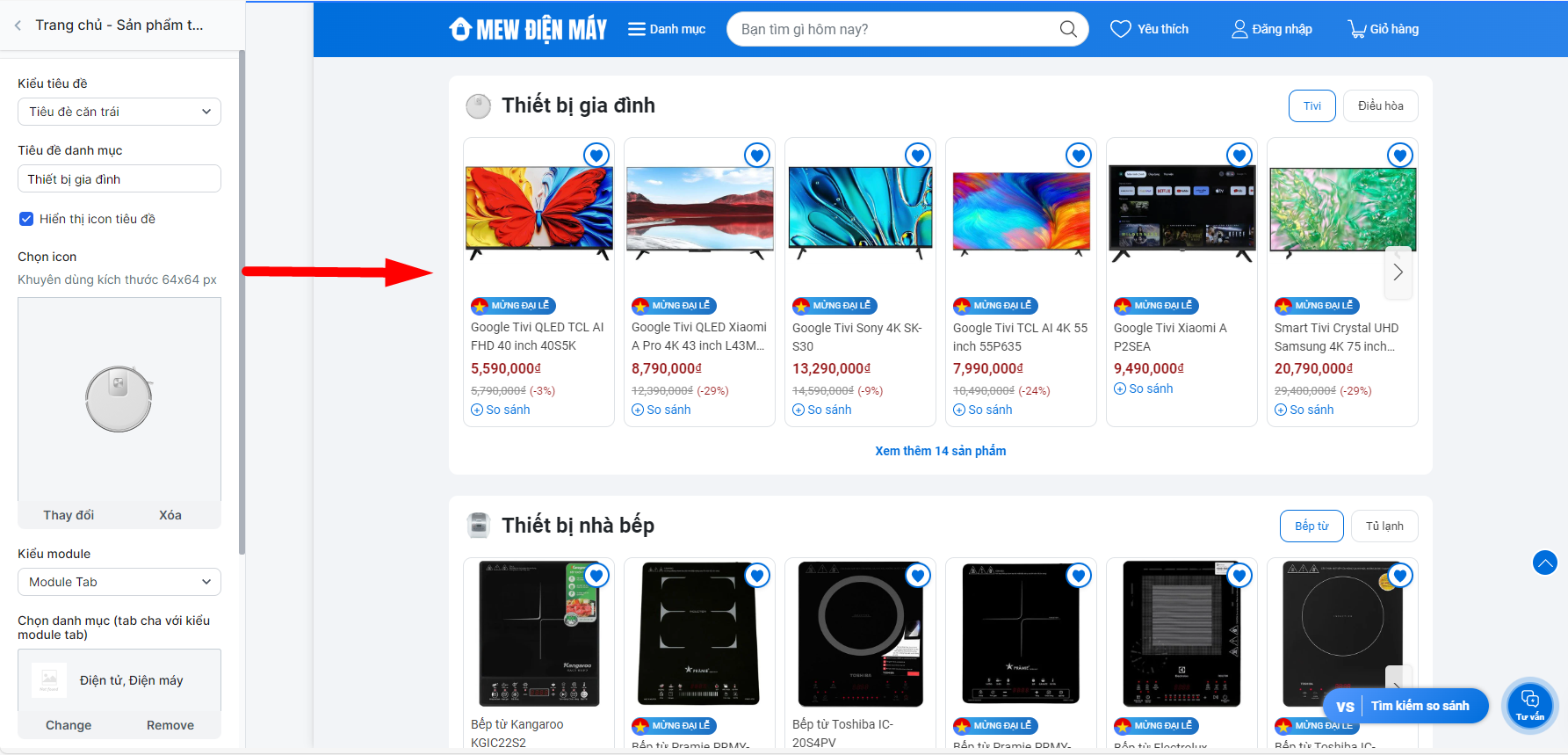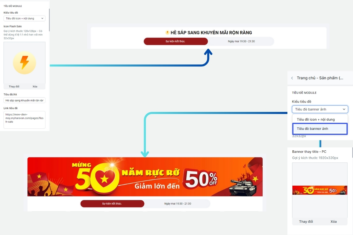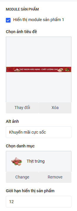 - Thiết lập 5 module sản phẩm sự kiện. Chọn ảnh tiêu đề, chọn nhóm sản phẩm đơn giản dễ dùng.