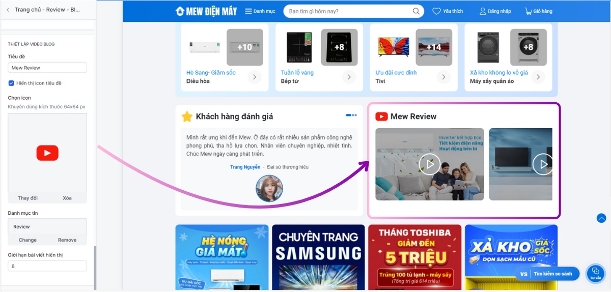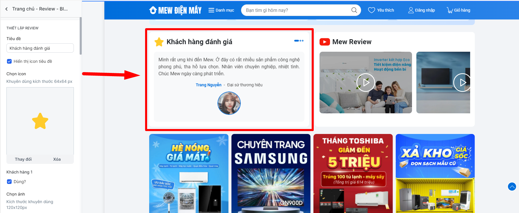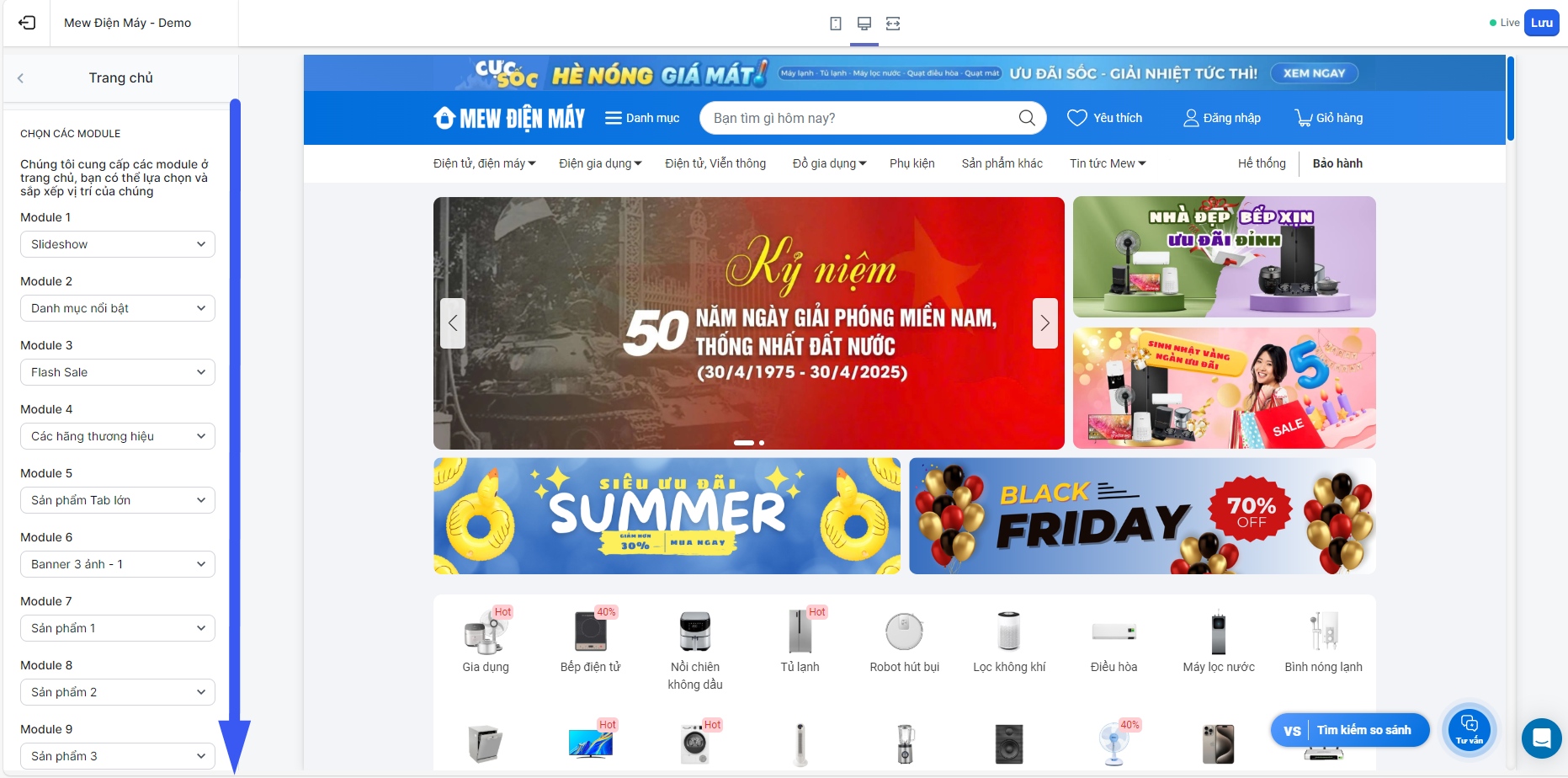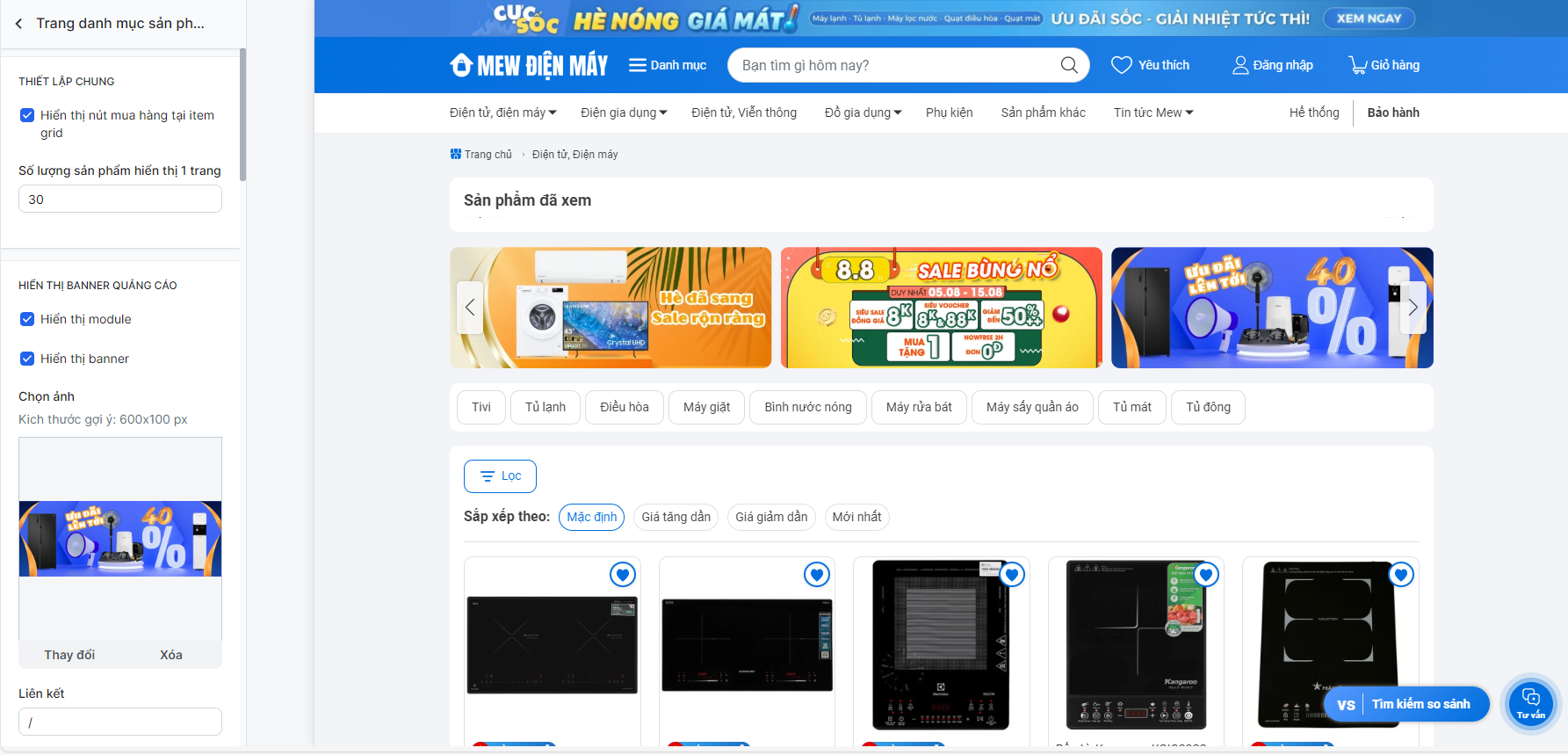 - Thiết lập 5 module sản phẩm sự kiện. Chọn ảnh tiêu đề, chọn nhóm sản phẩm đơn giản dễ dùng.