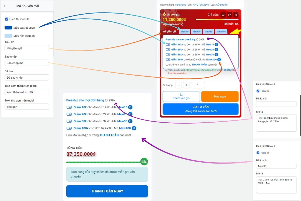 - Thiết lập/quản lý các mã giảm giá tại trang chi tiết sản phẩm và giỏ hàng