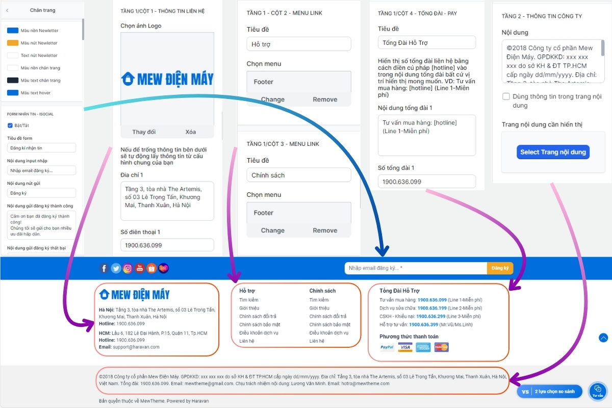 - Quản lý và thiết lập các mục liên quan đến phần chân trang