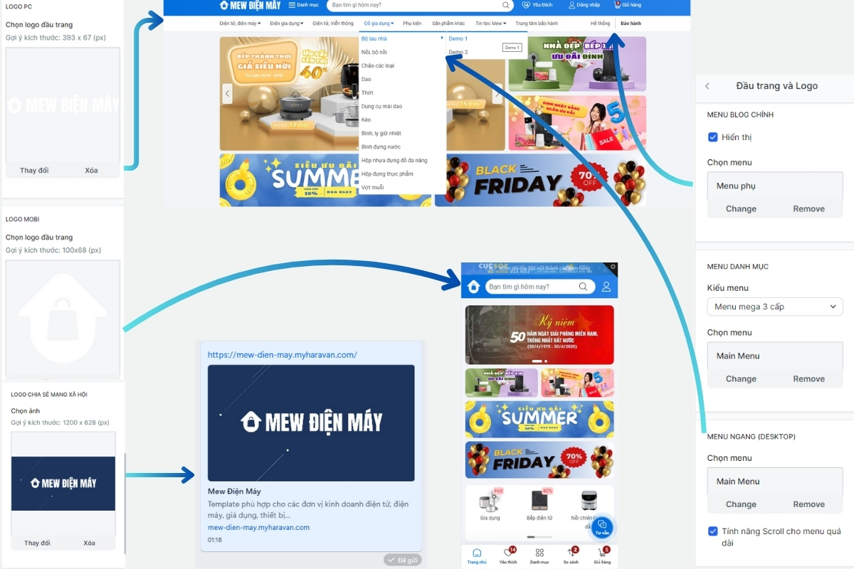 - Quản lý và thiết lập các mục liên quan đến phần đầu trang/ logo cũng như quản lý tuỳ chọn menu của bản PC và Mobile