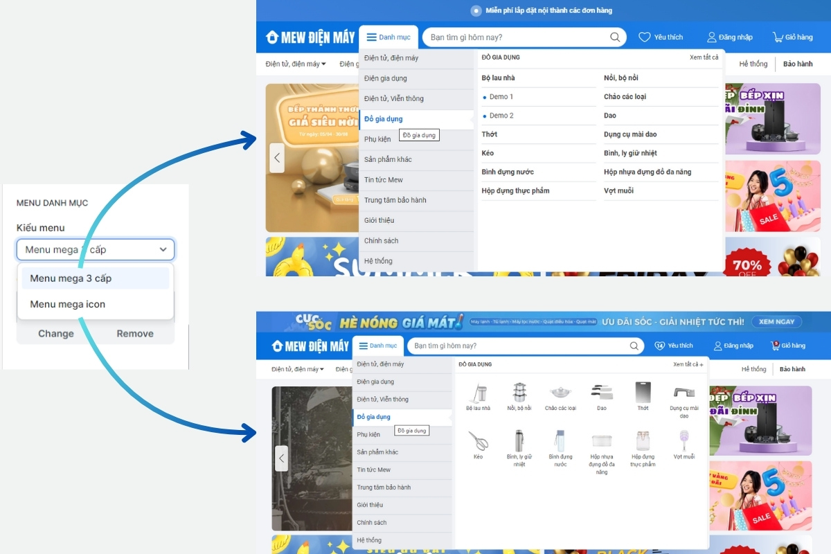 - Menu mega icon: Hiển thị 2 cấp menu gồm ảnh đại diện nhóm sản phẩm