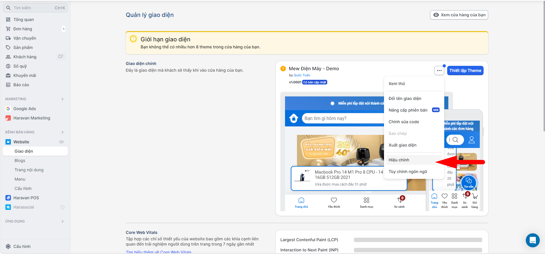 Sau khi cài đặt theme mới lên cửa hàng, bạn bấm vào THIẾT LẬP GIAO DIỆN để tùy chỉnh theme.