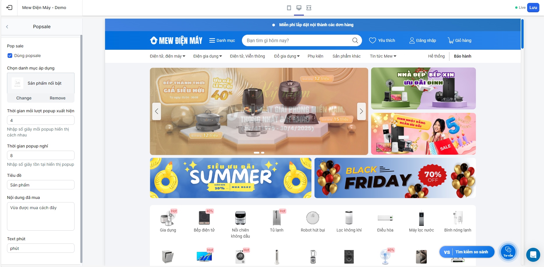 - Đầy đủ thiết lập thời gian, text cố định và lựa chọn danh mục để hiển thị ngẫu nhiên sản phẩm.