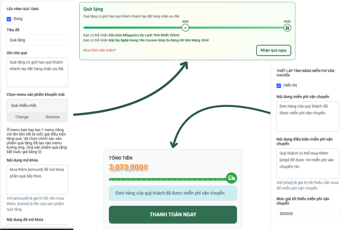 - Tinh năng cho phép bạn lựa chọn các sản phẩm để tặng kèm khi giỏ hàng đạt đến các mốc giá trị tương ứng.