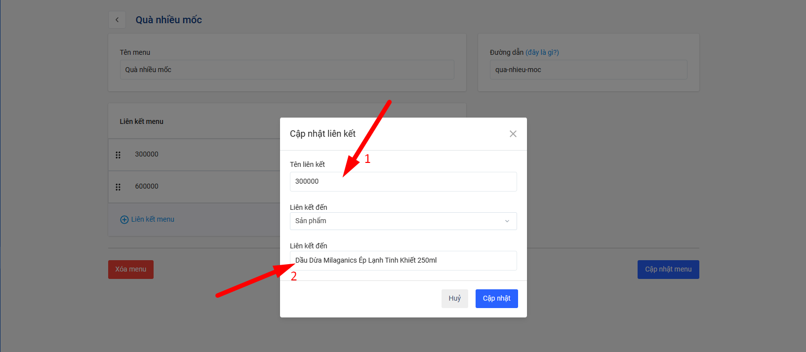 - Với tên liên kết menu chúng ta nhập giá trị của đơn hàng sẽ được nhận quà (1)