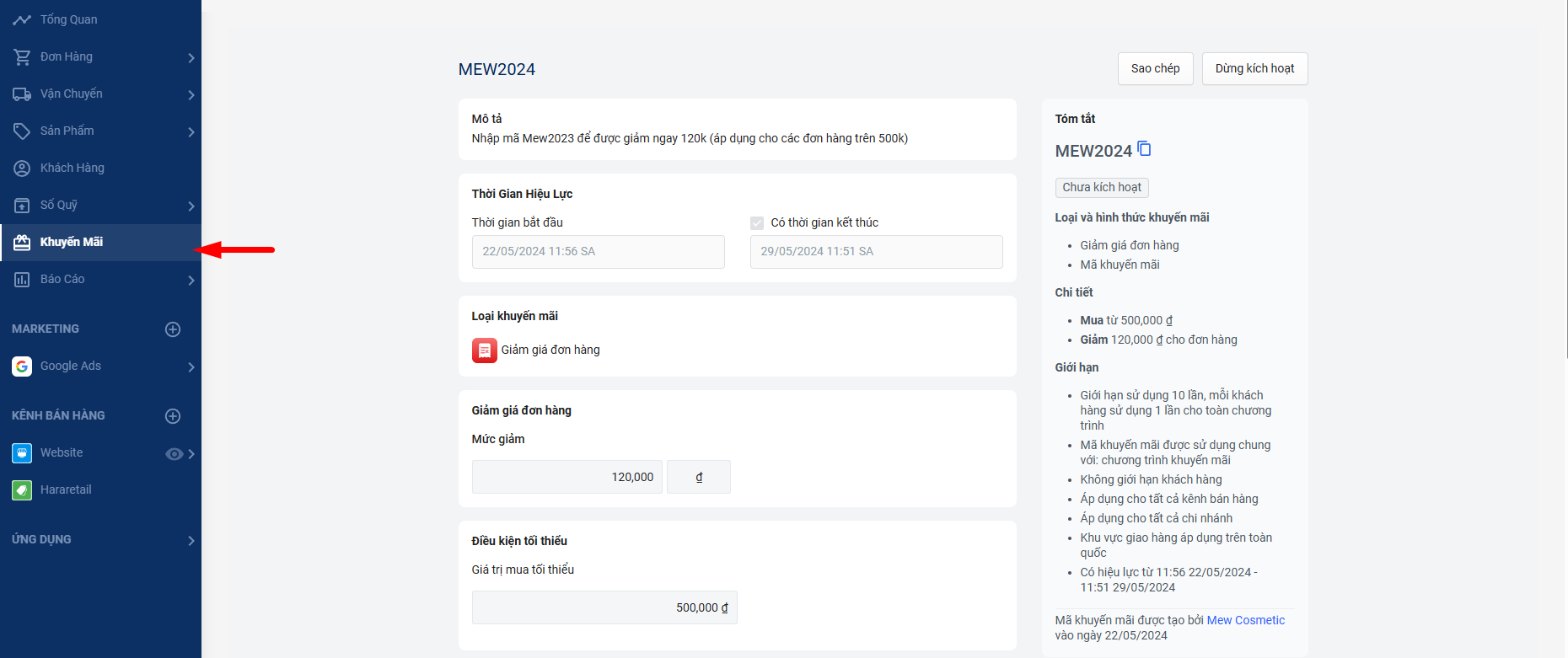 - Quý khách vui lòng tạo mã tại mục "Khuyến mãi" trong quản trị