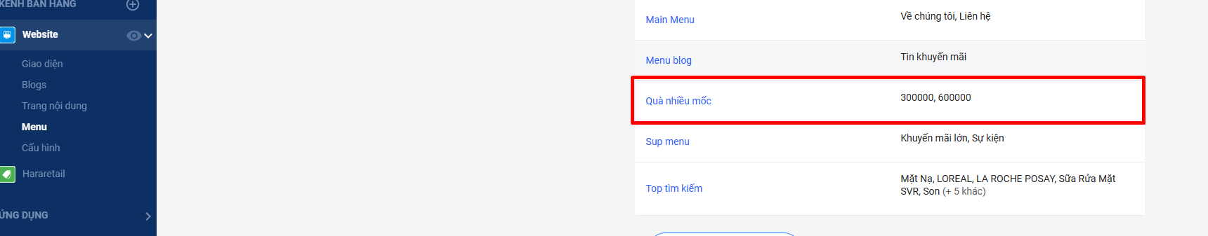 Bước 2: Tạo menu Quà tặng với các sản phẩm Quà đã tạo bên trên