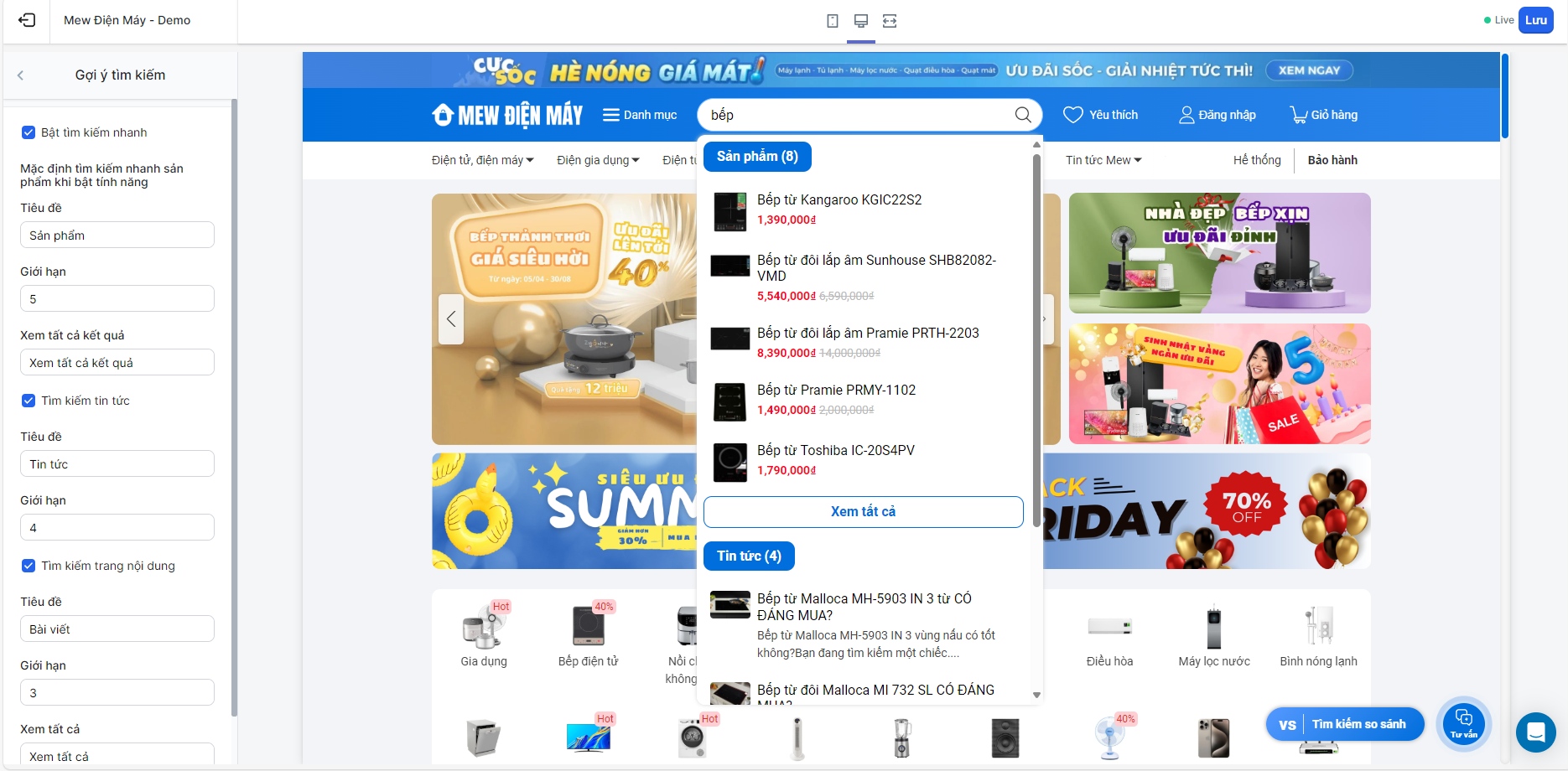 - Thay đổi số lượng kết quả hiển thị, số kết quả tìm kiếm phù hợp với từ khoá, vì lý do kỹ thuật cũng như tránh ảnh hưởng đến quá trình trải nghiệm mua hàng của quý khách, chúng tôi đề nghị không nên hiển thị quá nhiều số lượng kết quả tìm kiếm