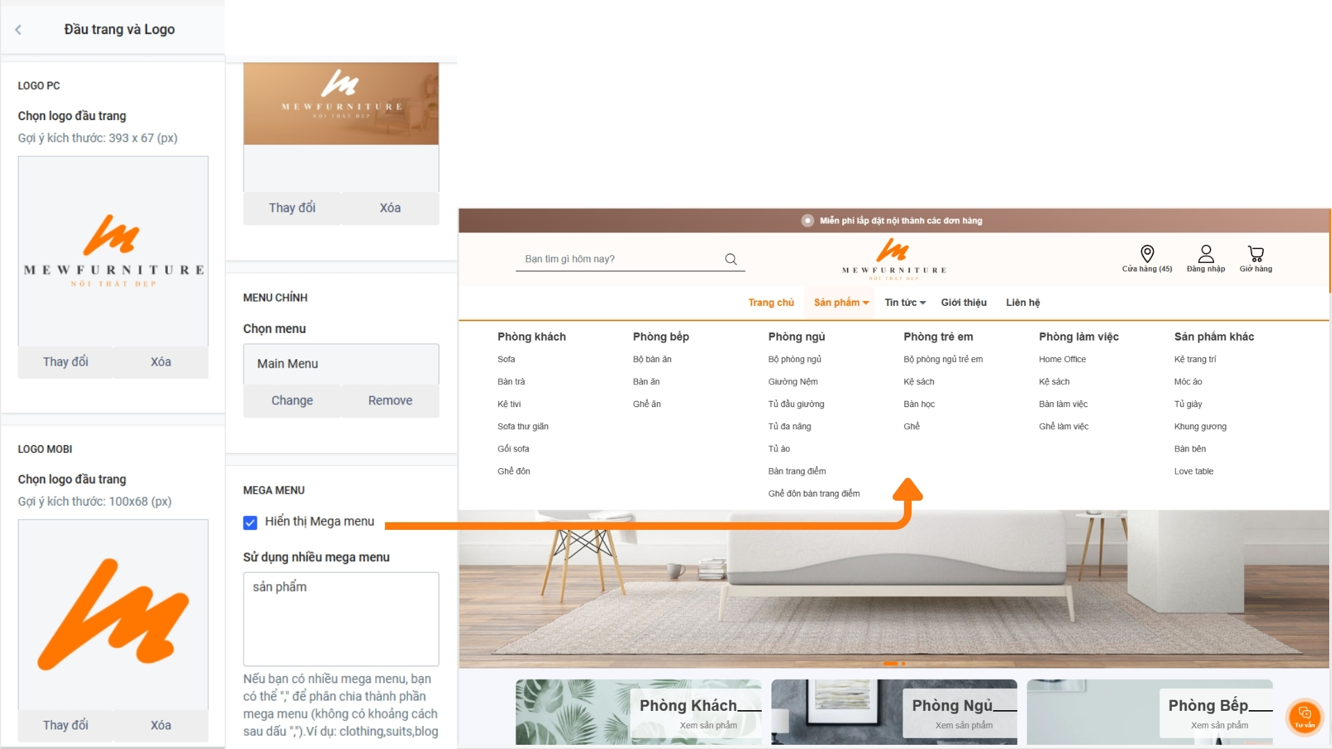 Quản lý và thiết lập các mục liên quan đến phần đầu trang/ logo cũng như quản lý tuỳ chọn menu của bản PC và Mobile