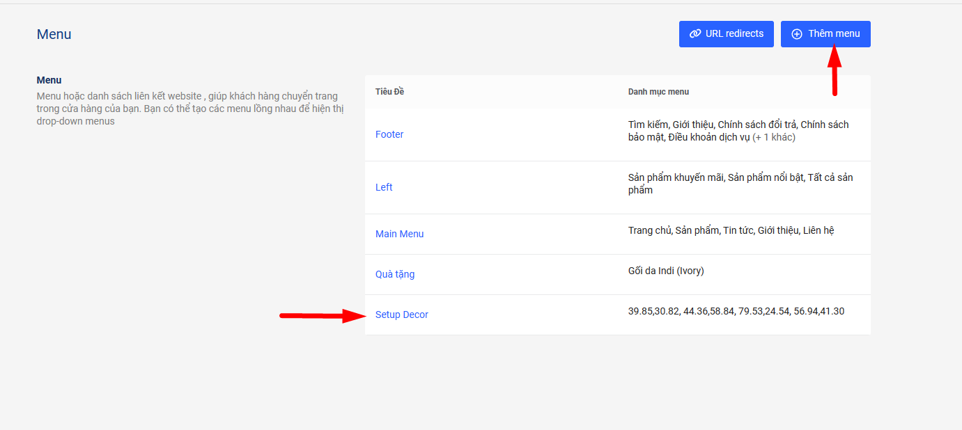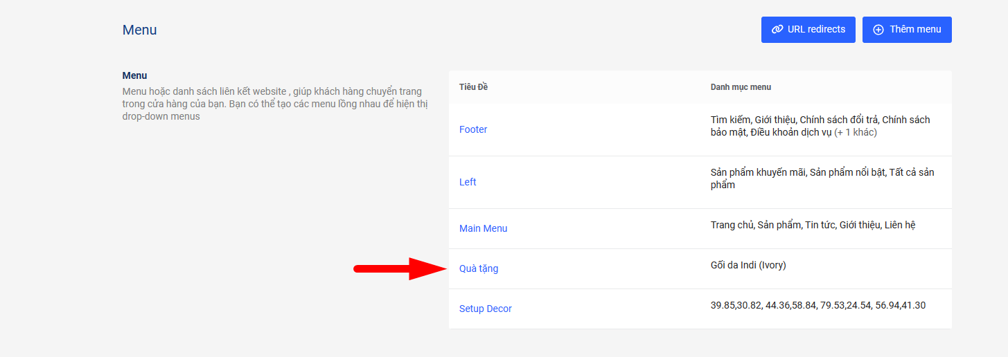 + Tạo menu Quà tặng với sản phẩm Quà đã tạo bên trên