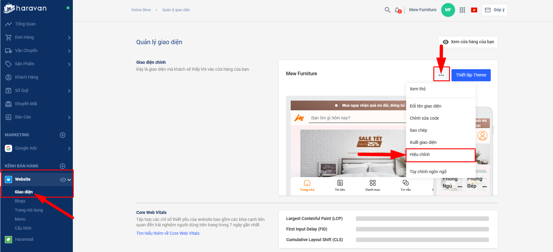 Sau khi cài đặt theme mới lên cửa hàng, bạn bấm vào Dấu ba chấm chọn Hiệu chỉnh để tùy chỉnh theme.