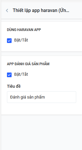 - Trong mục APP ĐÁNH GIÁ SẢN PHẨM: Bật để hiển thị app Product Reviews (Lưu ý app cần được cài trong phần ứng dụng Haravan và mất phí theo giá của ứng dụng)