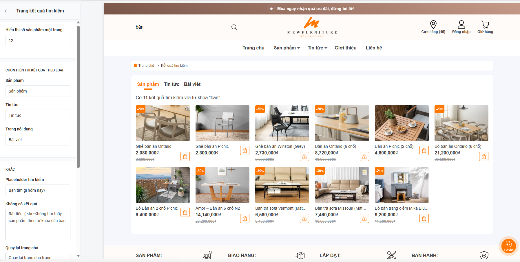 - Bật/tắt tìm kiếm nhanh theo bài viết/ trang nội dung, thay đổi số lượng kết quả hiển thị, số kết quả tìm kiếm phù hợp với từ khoá, vì lý do kỹ thuật cũng như tránh ảnh hưởng đến quá trình trải nghiệm mua hàng của quý khách, chúng tôi đề nghị không nên hiển thị quá nhiều số lượng kết quả tìm kiếm