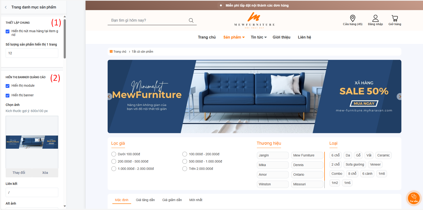 - (1) thiết lập bật tắt nút mua hàng tại item sản phẩm, số lượng sản phẩm hiển thị trên 1 trang