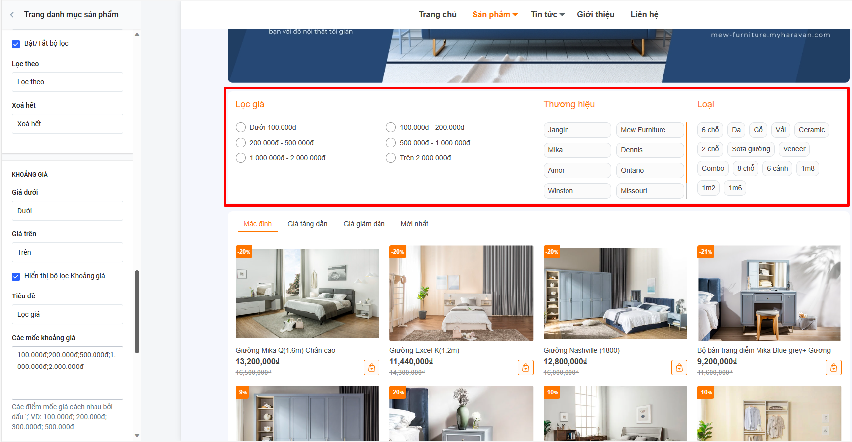 - Thiết lập bộ lọc: Giá, loại, thương hiệu